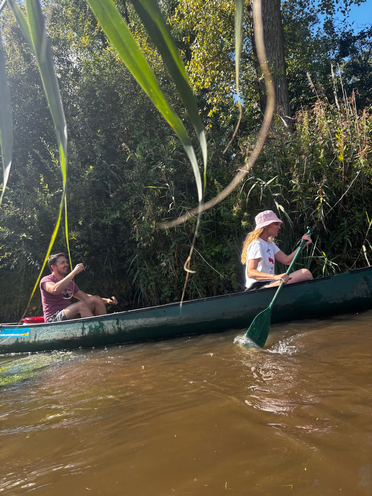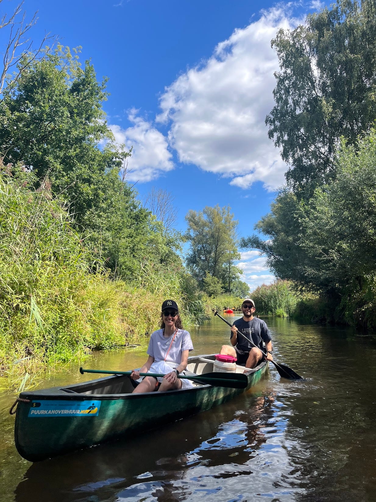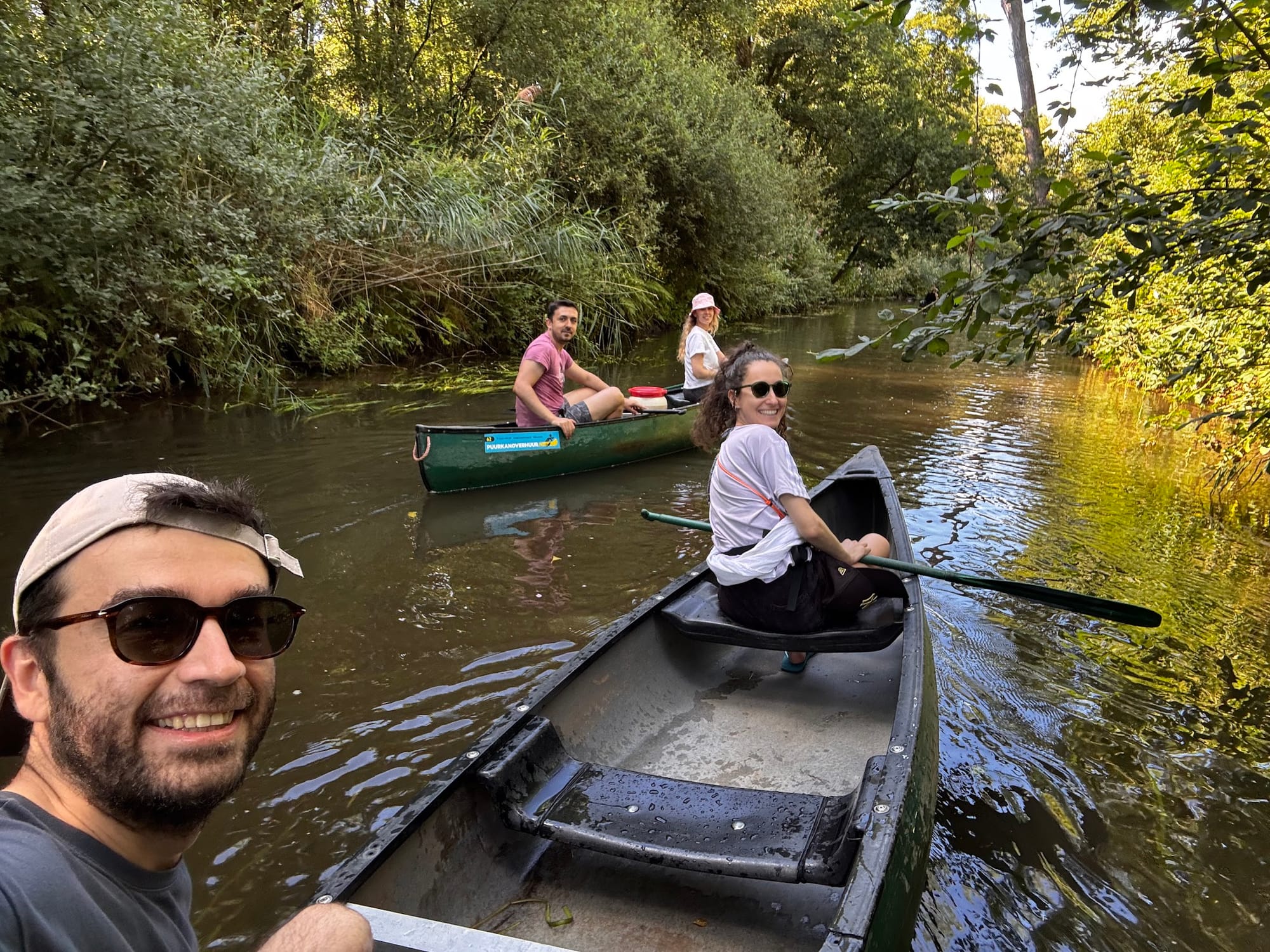 Günü ise kürek çekerek sonlandırmaya karar verdik. Hava harikaydı, planımız Valkenswaard’da kano yapmak oldu. Arabayı Canoe rental Valkenswaard otoparkına bıraktık; oradan otobüslerle nehrin başlangıç noktasına götürdüler ve kanolarımızı teslim ettiler. Yaklaşık 8 kilometrelik bir nehir rotasında kürek çektik ve sonunda tekrar arabalarımızın olduğu noktaya geri döndük. Suyun sesi, yeşillikler ve güneşin ışığıyla gerçekten huzurlu bir kapanış oldu. Manzaradan birkaç kare de aşağıda 📸🌊
