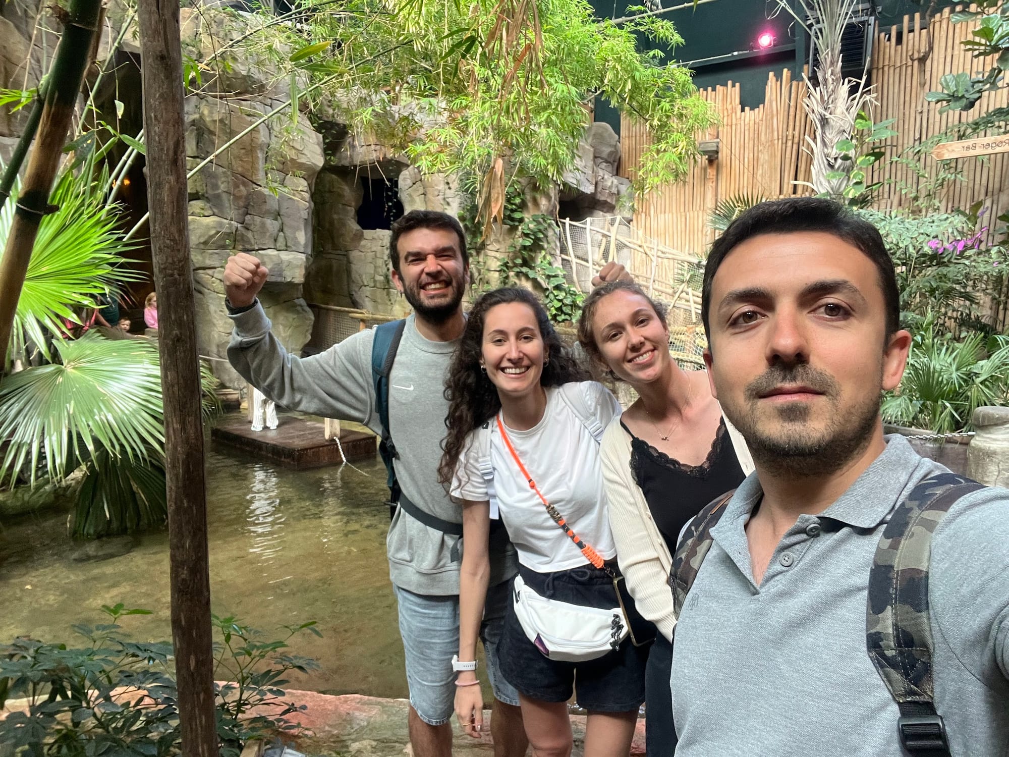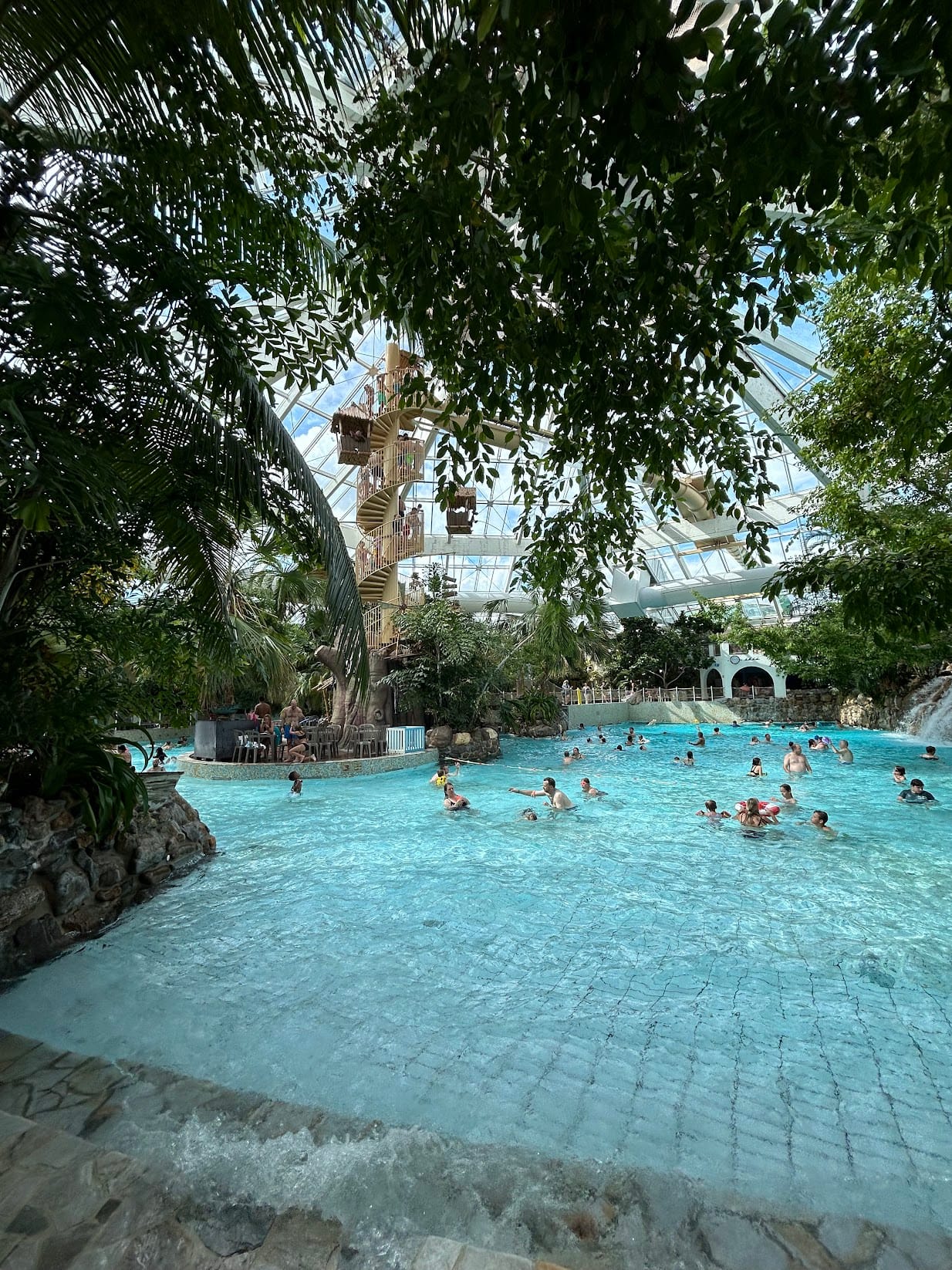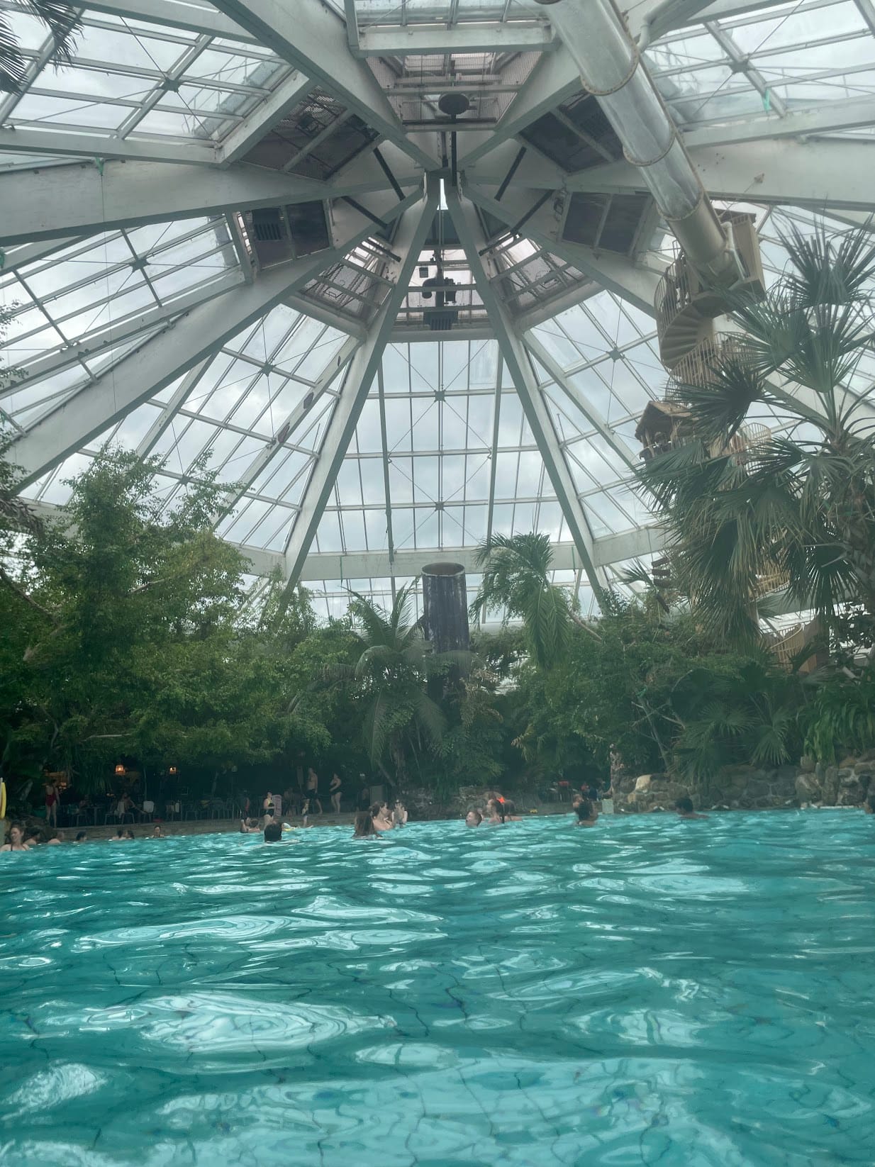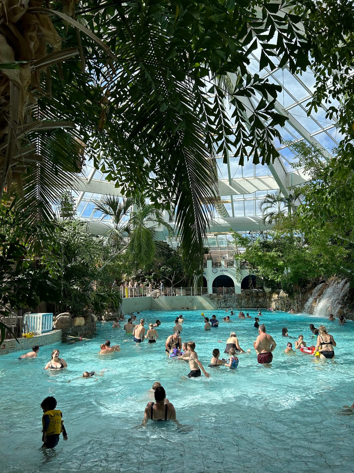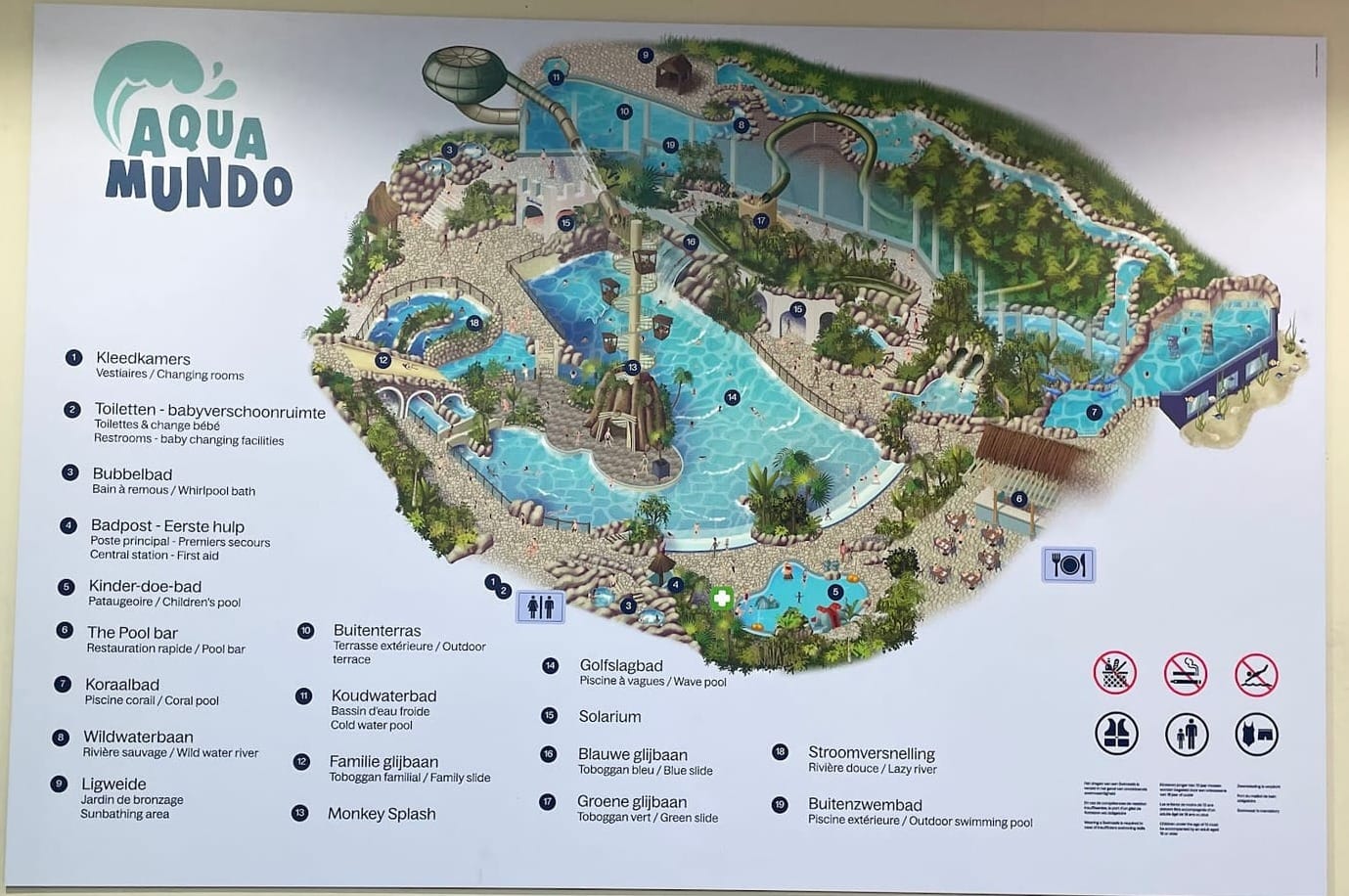 Gittiğimiz yer Aqua Mundo De Vossemeren’di — Belçika’nın Lommel şehrinde yer alan büyük bir su parkı. Aslında Center Parcs De Vossemeren adlı tatil köyünün içinde yer alıyor. İçinde dev kaydıraklar, dalga havuzu, tropik bitkilerle çevrili sıcak havuzlar ve cam kubbenin altından süzülen gün ışığı var 🌴