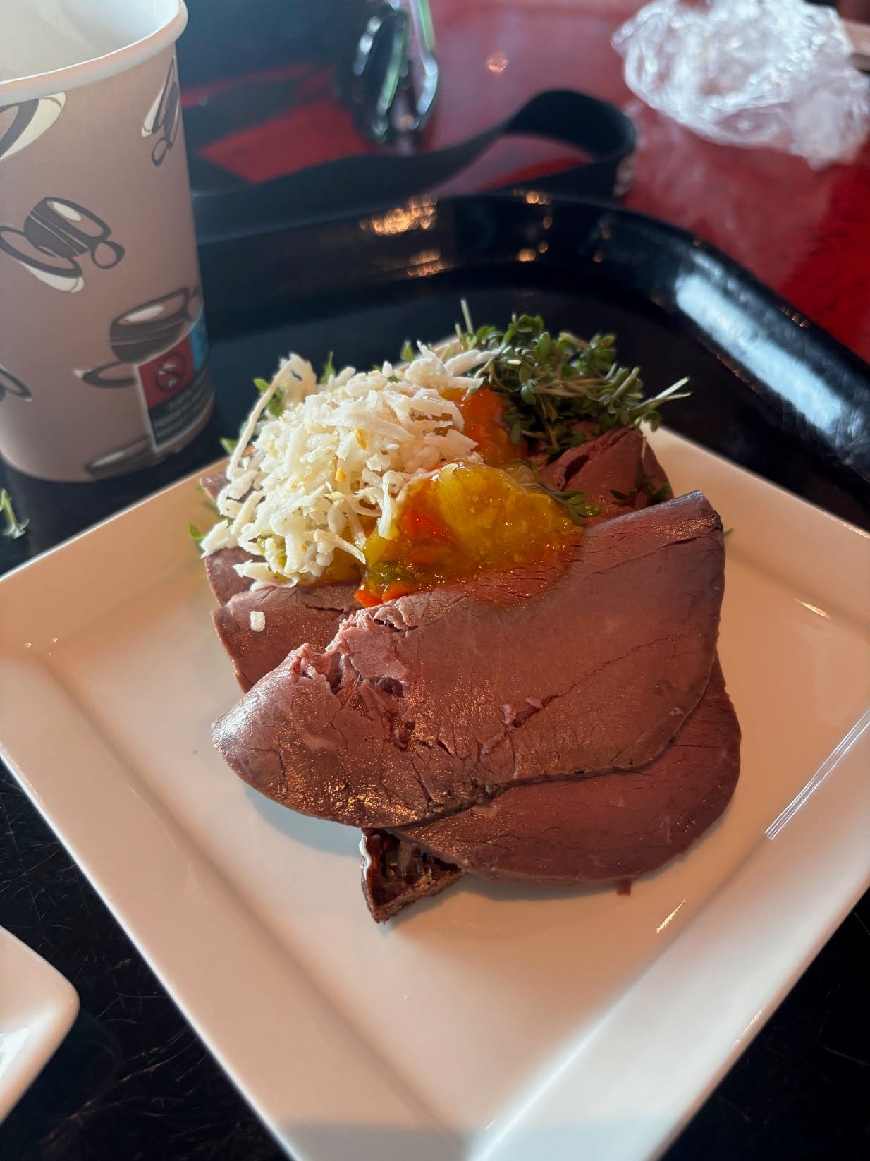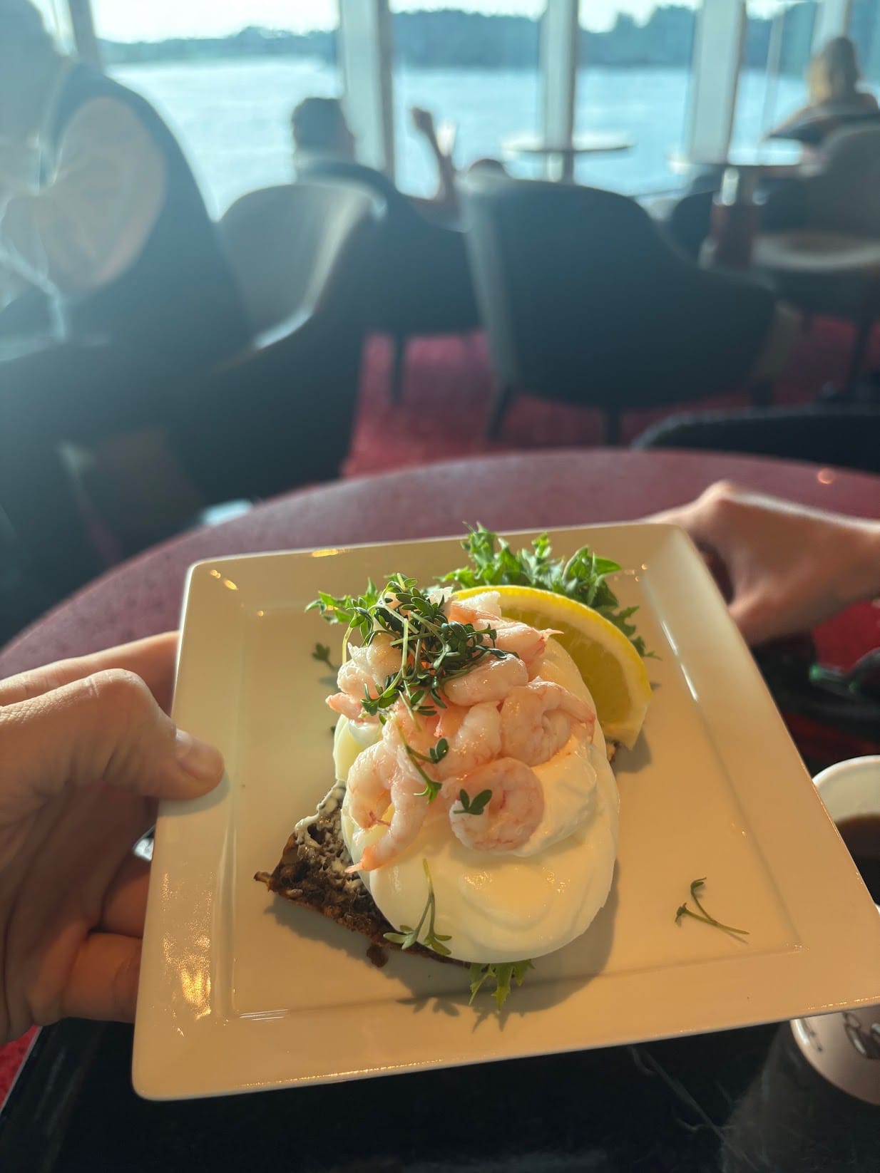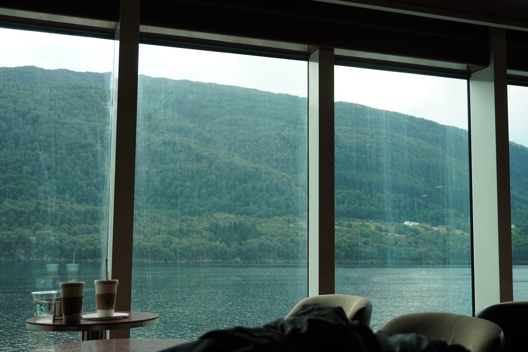 Biraz da içeride bir yere oturduk. Birer dilim ekmek üstü roast beef ve karides yedik, 117 NOK verdik. Manzaranın tadını çıkarıp yolculuğun bitmesini bekledik.
