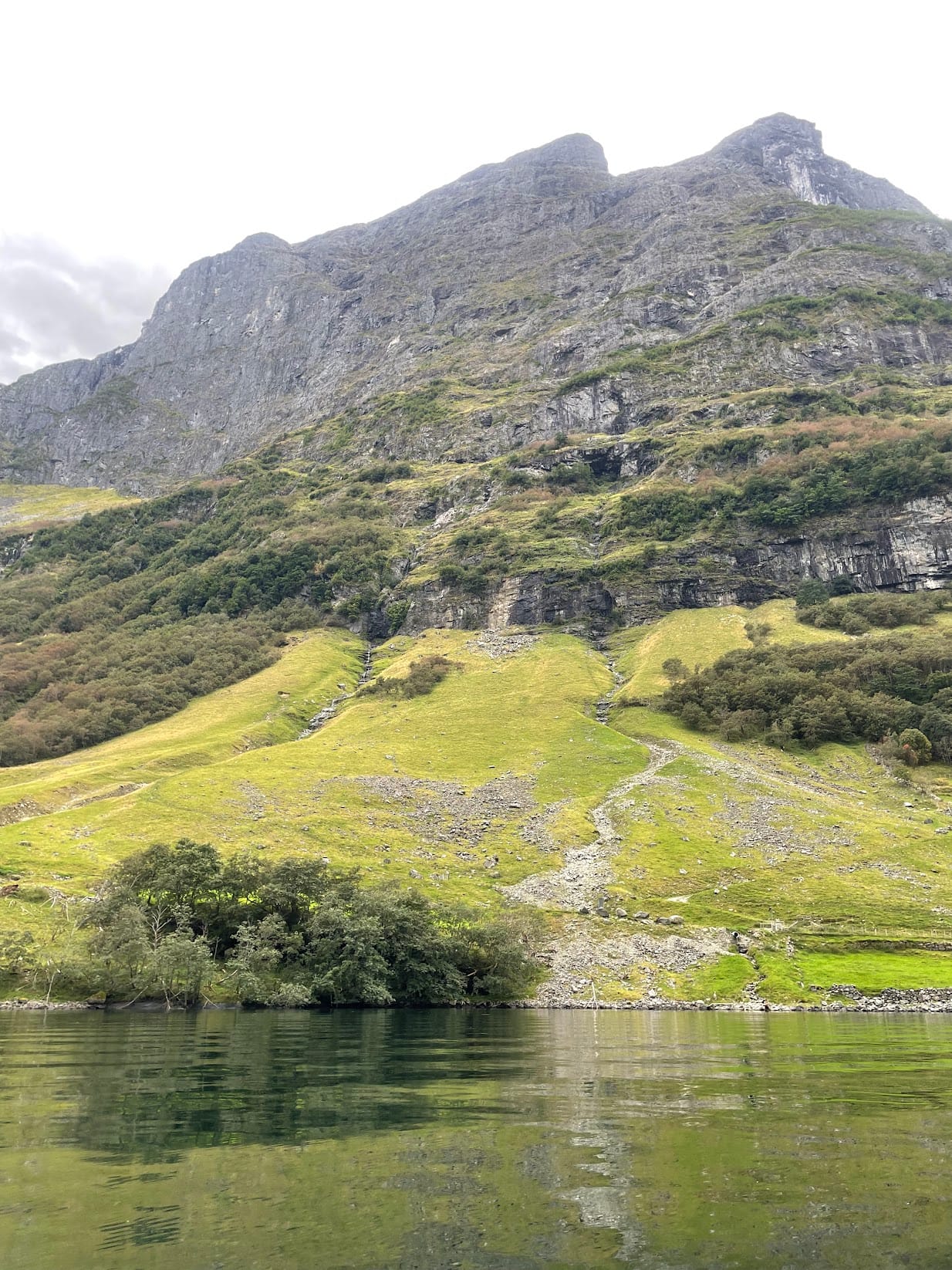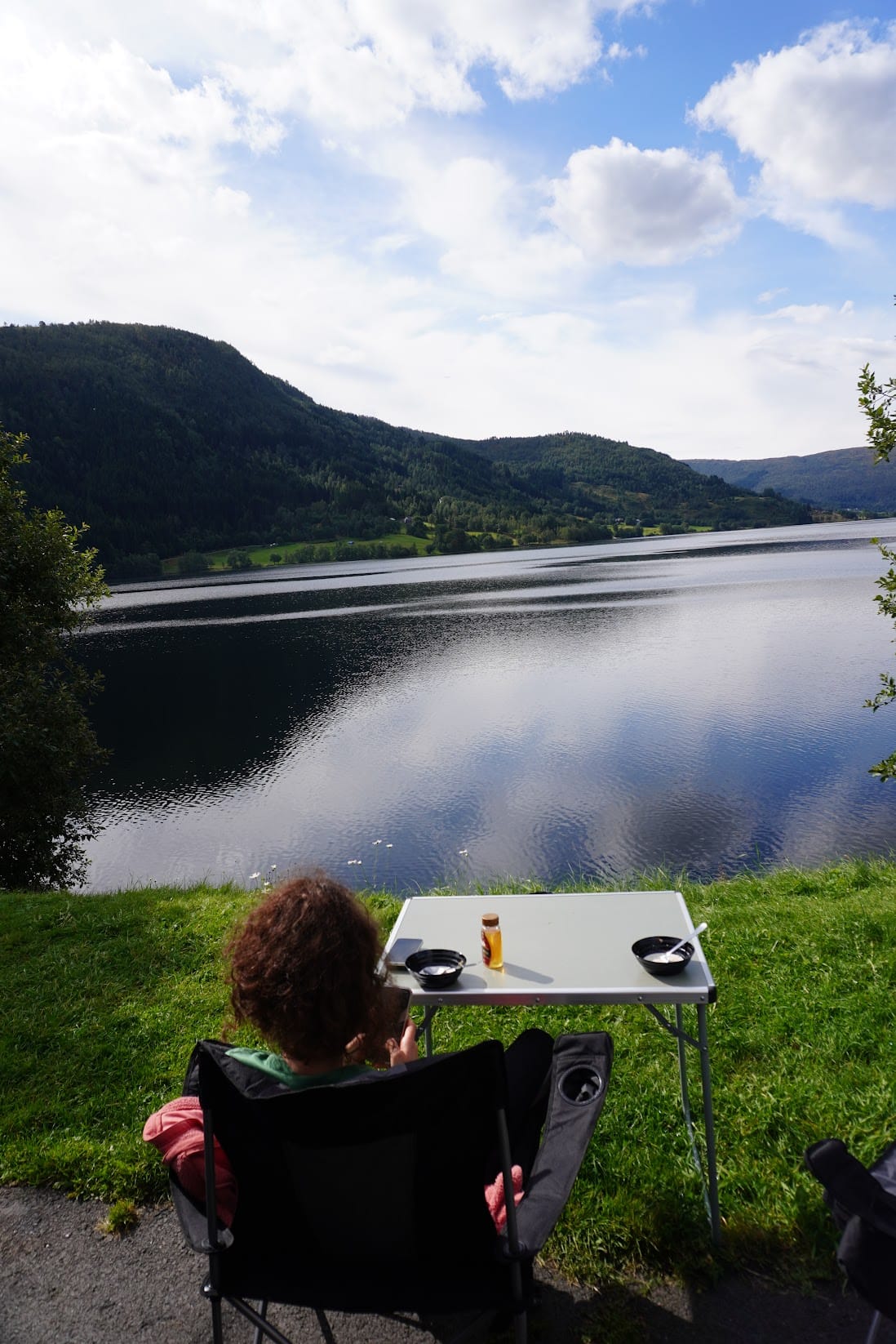 Biraz ileride Skjørbakkane Utsiktspunkt seyir noktasından geçip yolumuza devam ettik. Ardından Oldevatnet Gölü kenarındaki Ytineset noktasına vardık. Orada gölün kenarında aracımızı park edip dinlenebileceğimiz bir nokta bulduk. KONUM