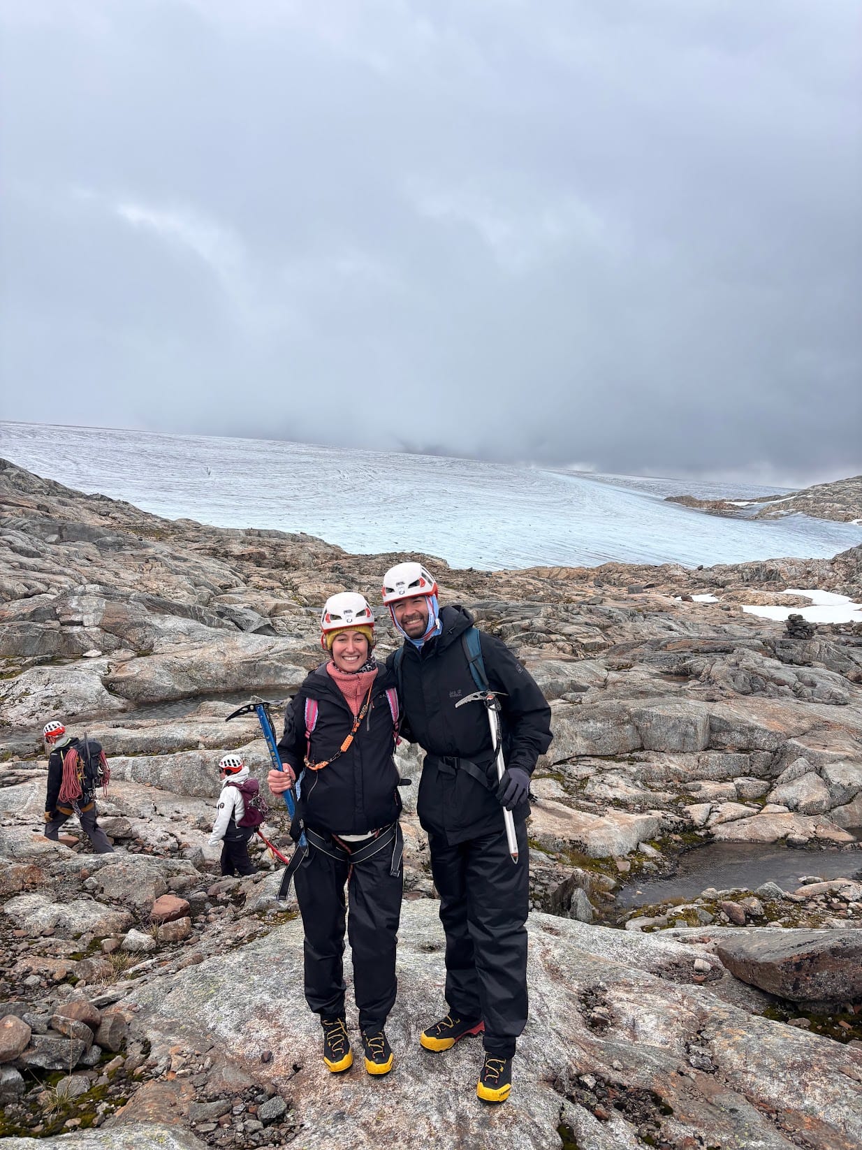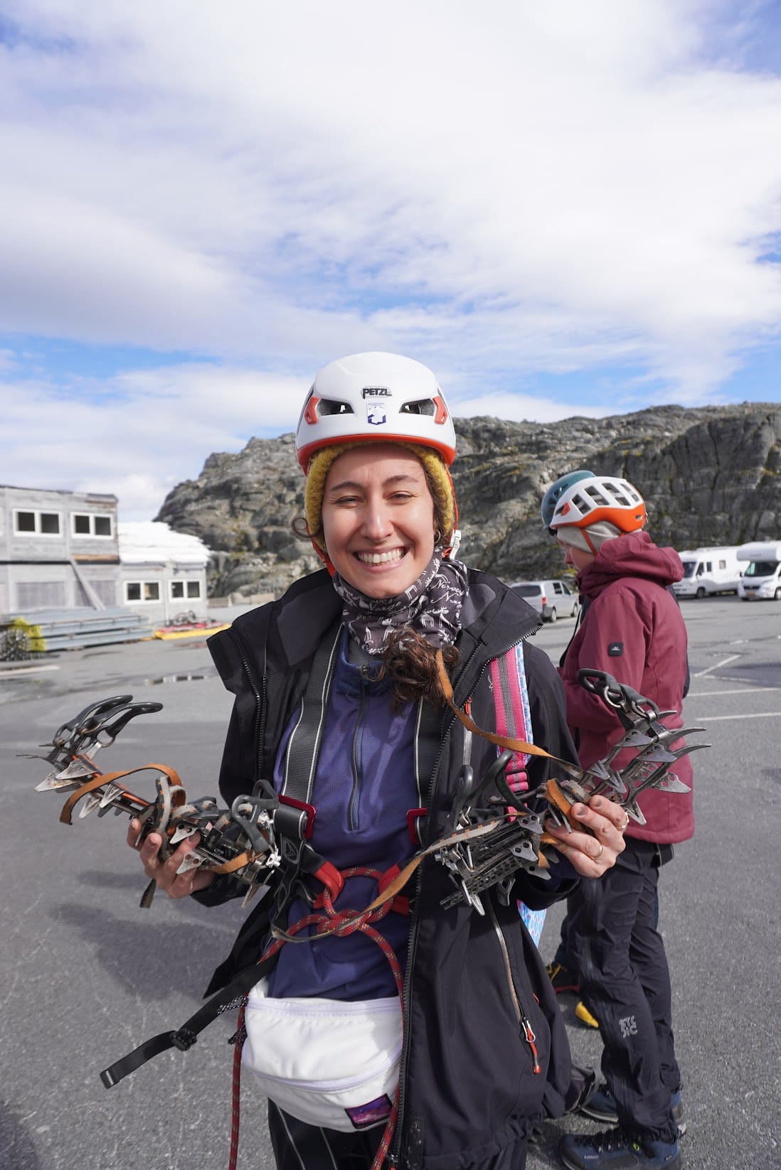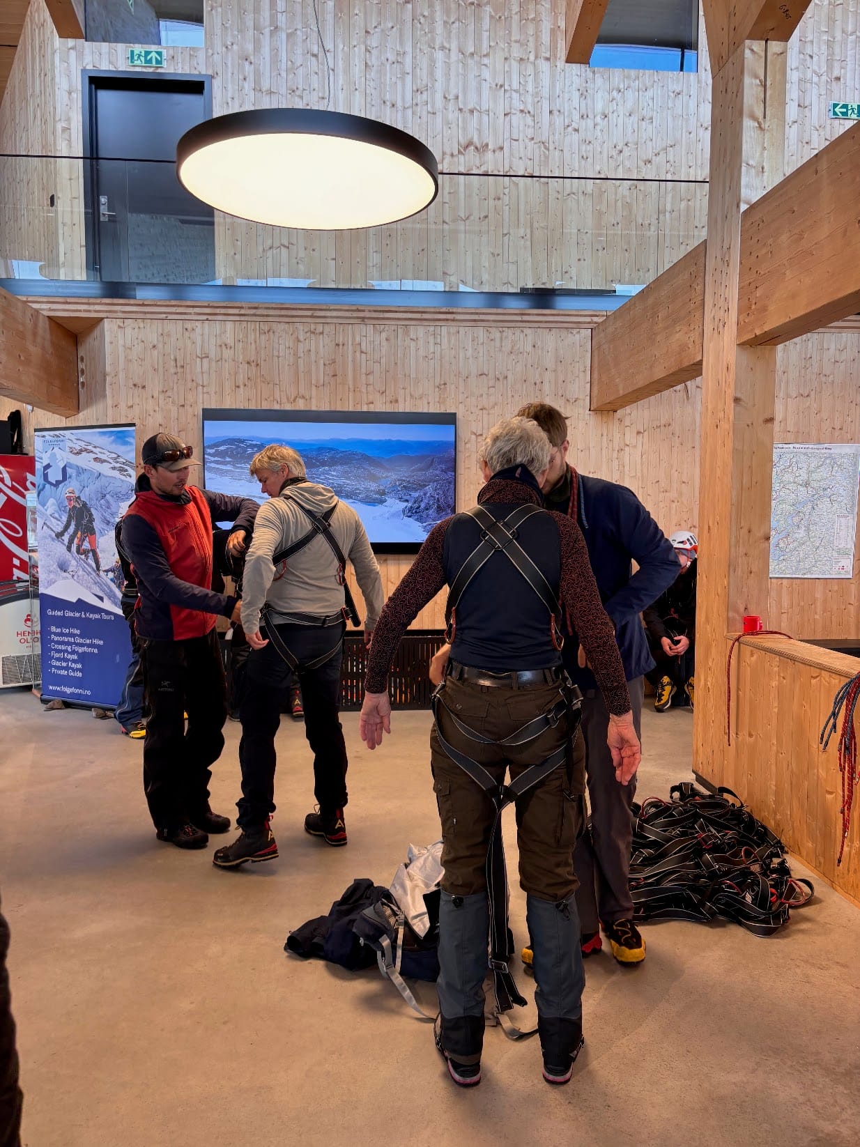 Hazırlıklara başlıyoruz — ayakkabılar tur fiyatının içinde ama “su geçirmez pantolon da kiralayalım” diyoruz, hem buz sebebiyle, hem de ara ara sürekli yağmur atıştırıyor, kişi başı 75 NOK veriyoruz.