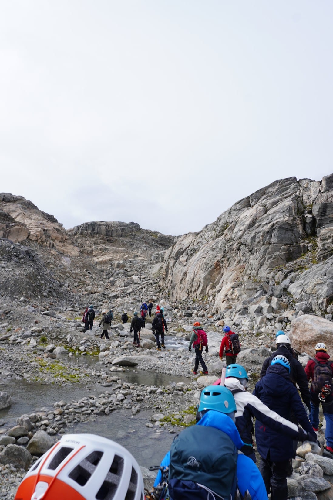 Yürüyüş ilk bir saat taşlık alanda başlıyor ve devam ediyor. Orada eski bir ski center varmış, hala ekipmanları görünür halde ama iflas etmişler, buzullar eridikçe o ekipmanlar aşağı kayıyormuş. Güvenlik sebebiyle, rotayı o alanın sağına dolanarak geçiyoruz.