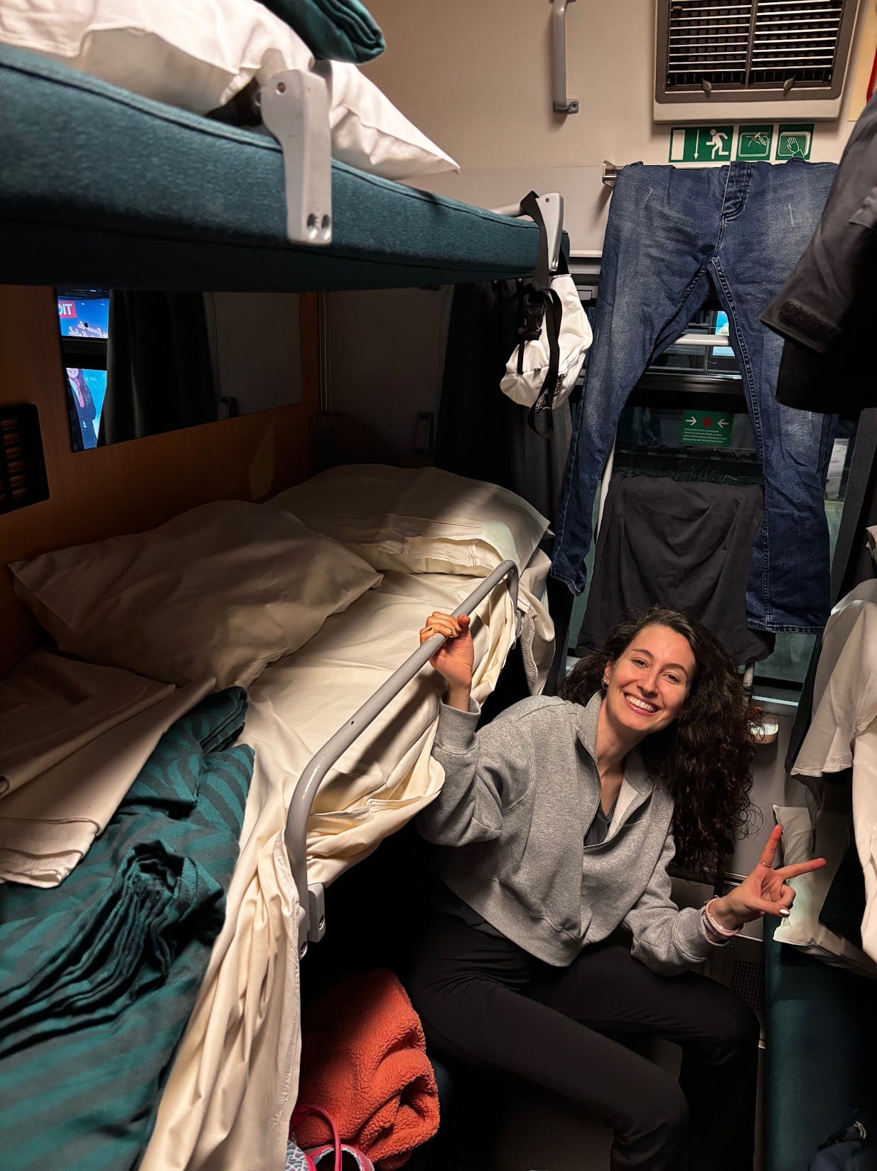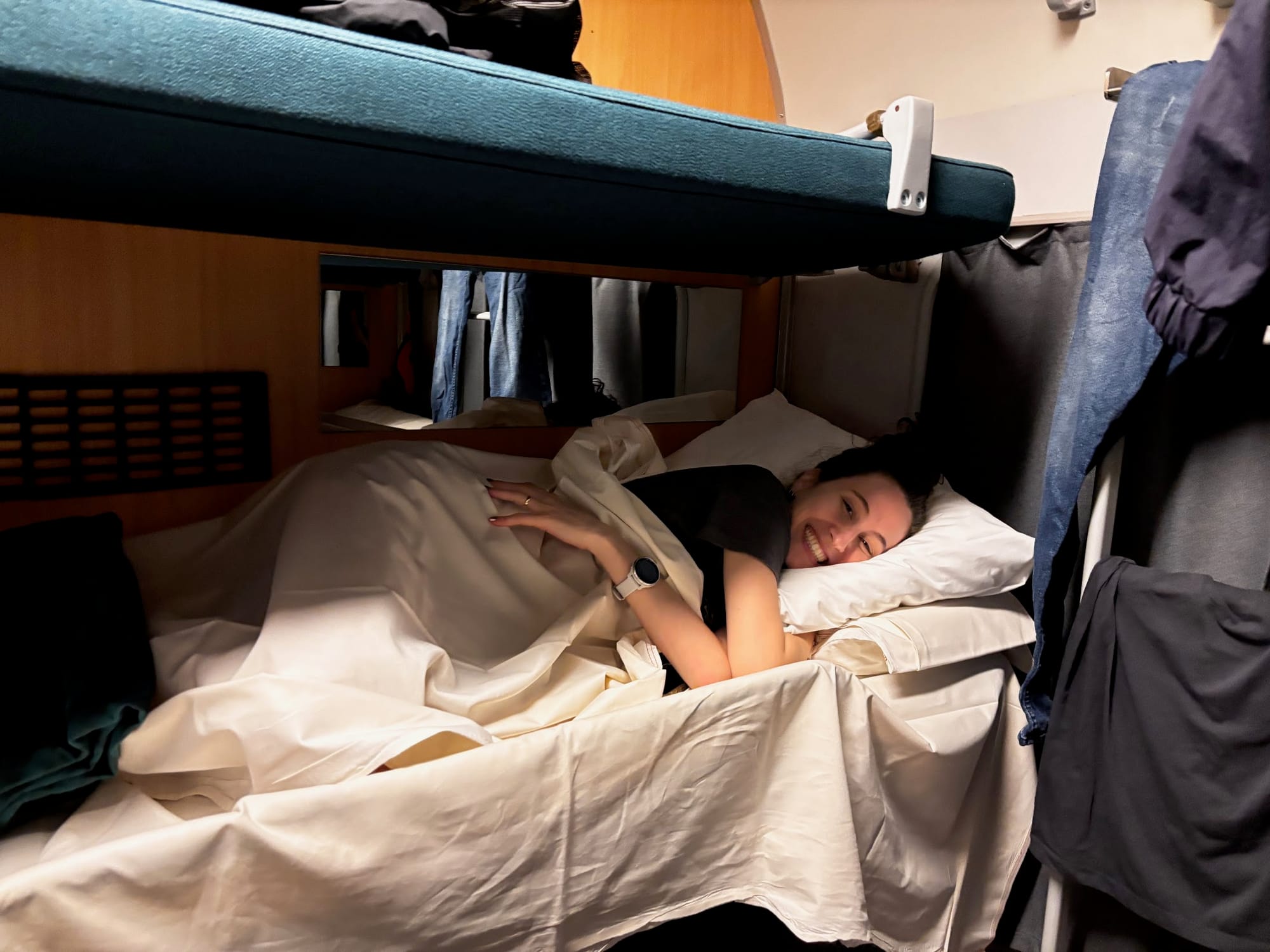 Kompartmanda 6 yatak var, biz uyumak için ortadakileri seçtik. Trenin 22:52'de harekete geçişiyle beraber yatışa hazırlanıyoruz (Genel olarak çarşaflar, yastıklar temizdi). Yolculuk 7.5 saat sürecek ve sabah 6:30 gibi Bergen'de olacağız, o sebeple keşke daha uzun sürseydi de daha fazla uyuyabilseydik dilekleriyle uykuya dalıyoruz🤭😂.