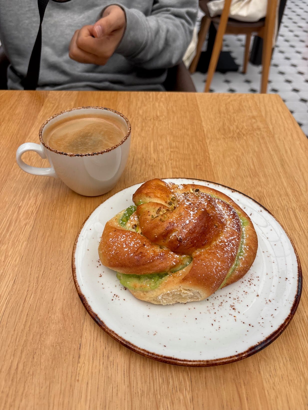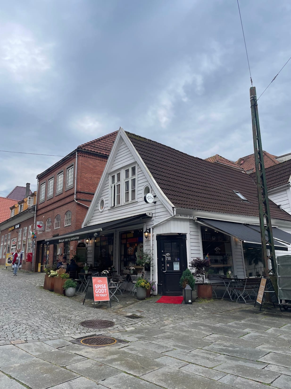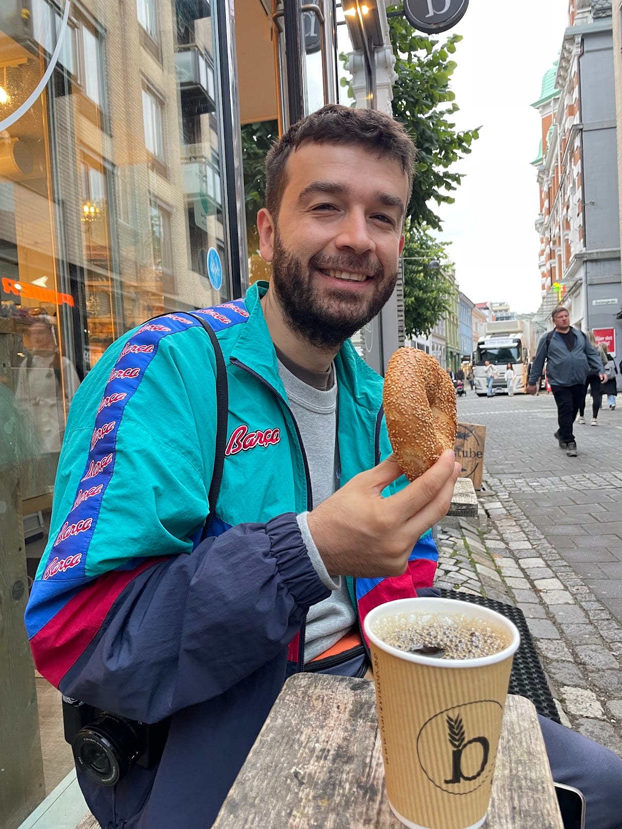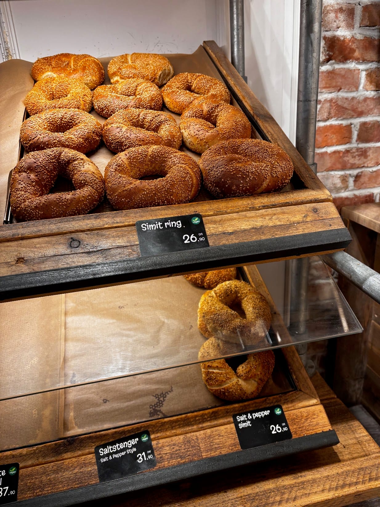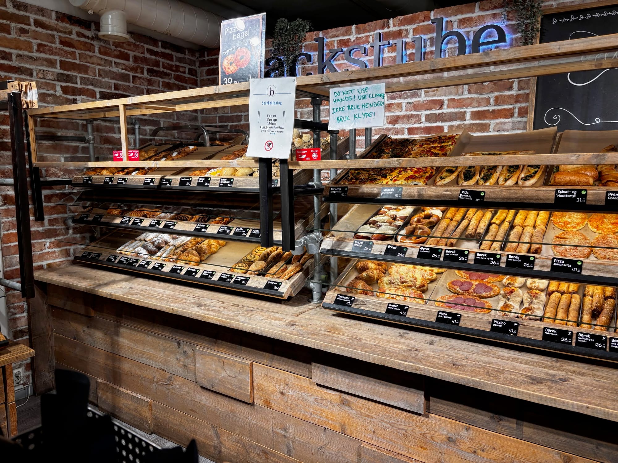 İlk durağımız Backstube Bergen oldu. Aha o da ne? Etiketler, ürünler anlık şok geçirmemize sebep oldu. Simitler, börekler... Aşırı mutlu olup birer simit (26 NOK) ve çay içtik (33 NOK) 🥐☕️.