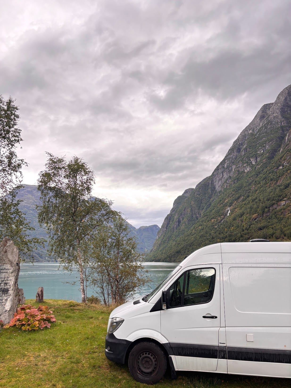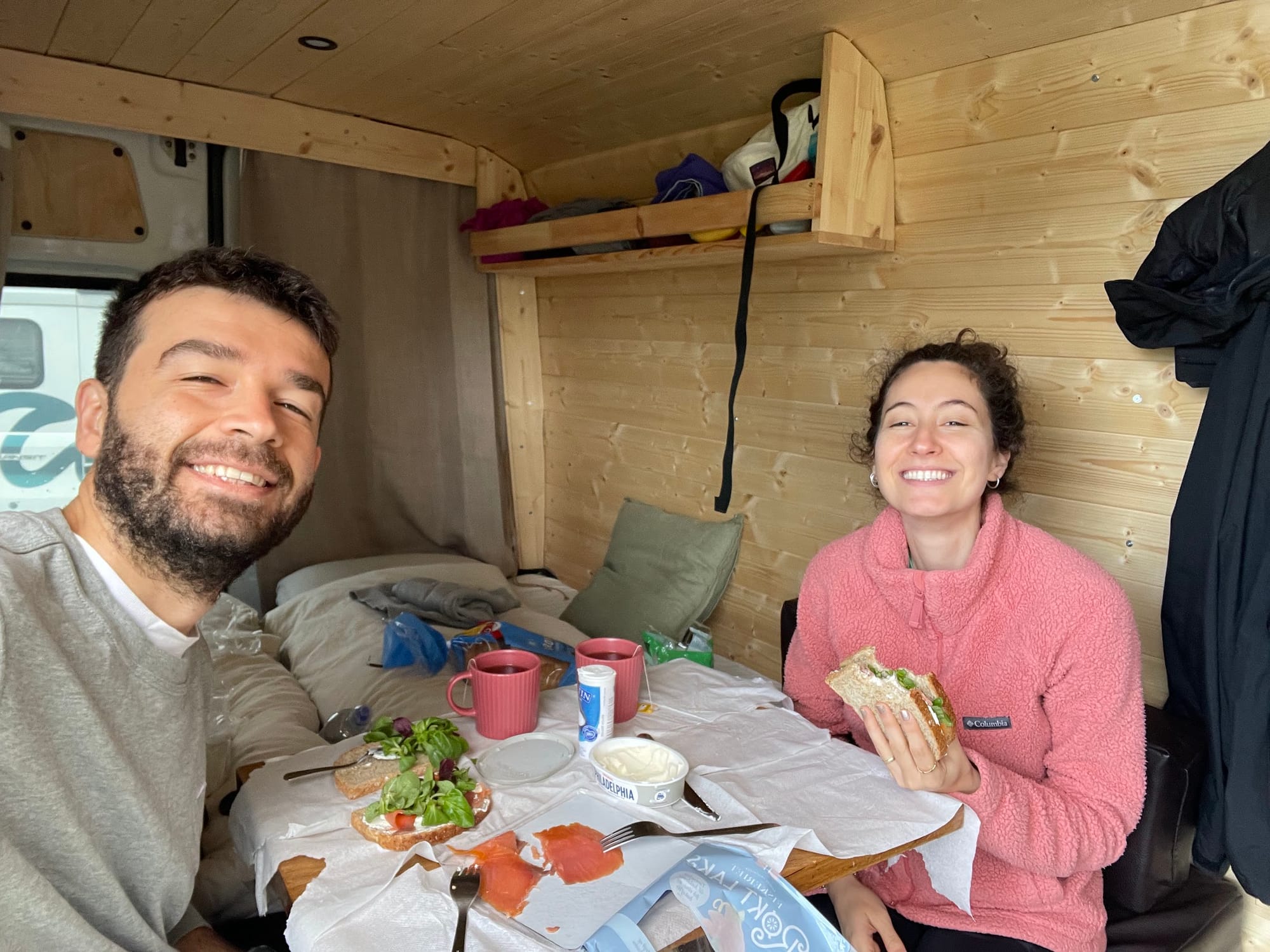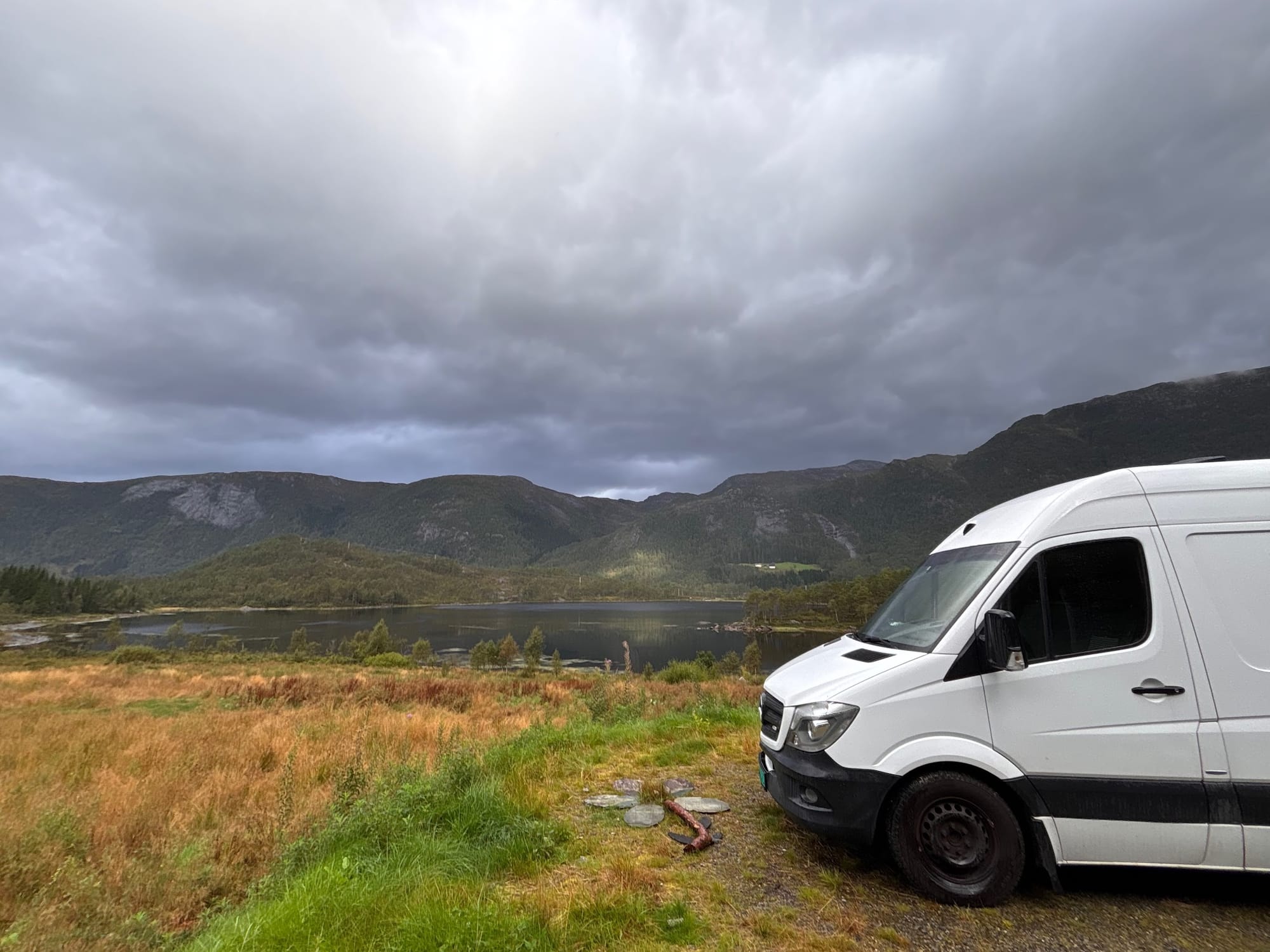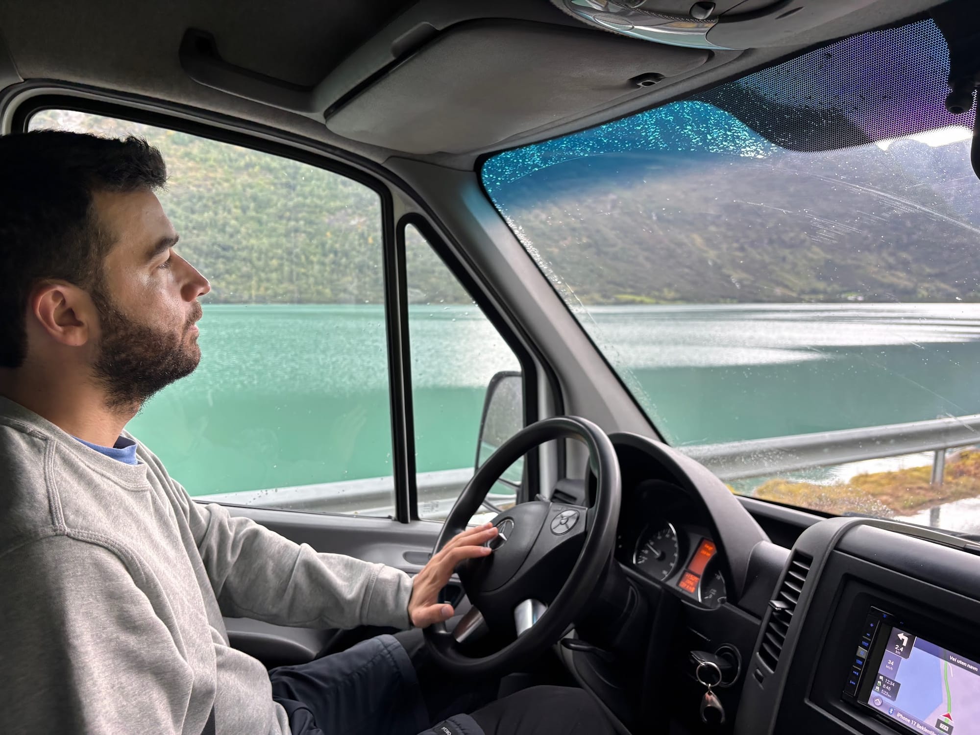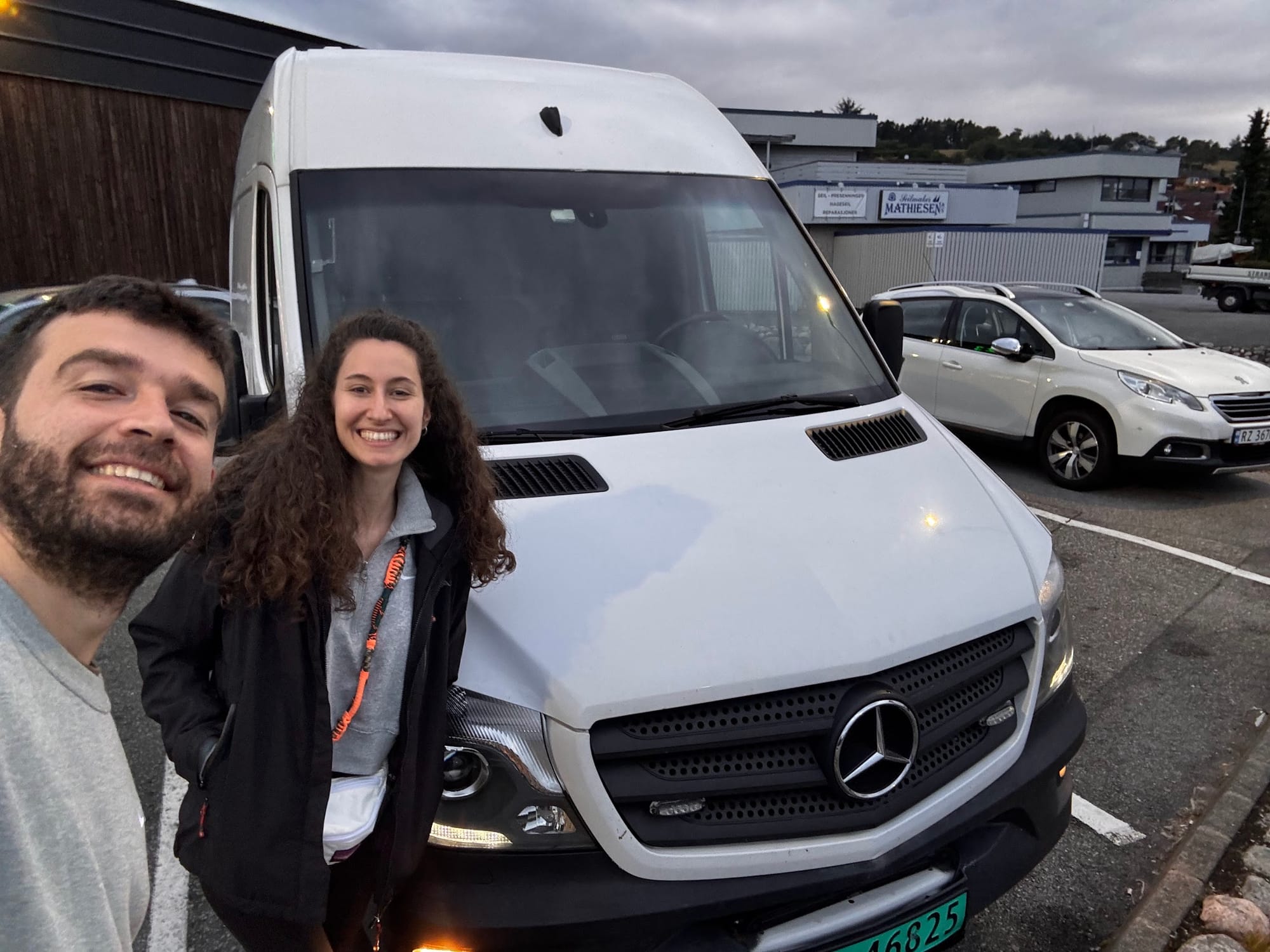 Feribottan indikten sonra karavanı Birk’ten (Firma temsilcisi) teslim alacaktık. Birk bizi limandan alacaktı. Etrafı kesmeye başladık. Bir tane karavan vardı ama üzerinde “Cabin Campers” yazmıyordu, emin olamadık. Derken biri aradı — bizim adam! 🙌 Bindik karavana, teslim eden kişiyi evine bıraktık, evinin önünde tüm detayları anlattı, anahtarları verdi ve artık karavanımız bizdeydi. Araç bir Mercedes Sprinter. Karavan detaylarını ayrı bir yazıda anlattım, buyrunuz LINK-TIK ✌️.