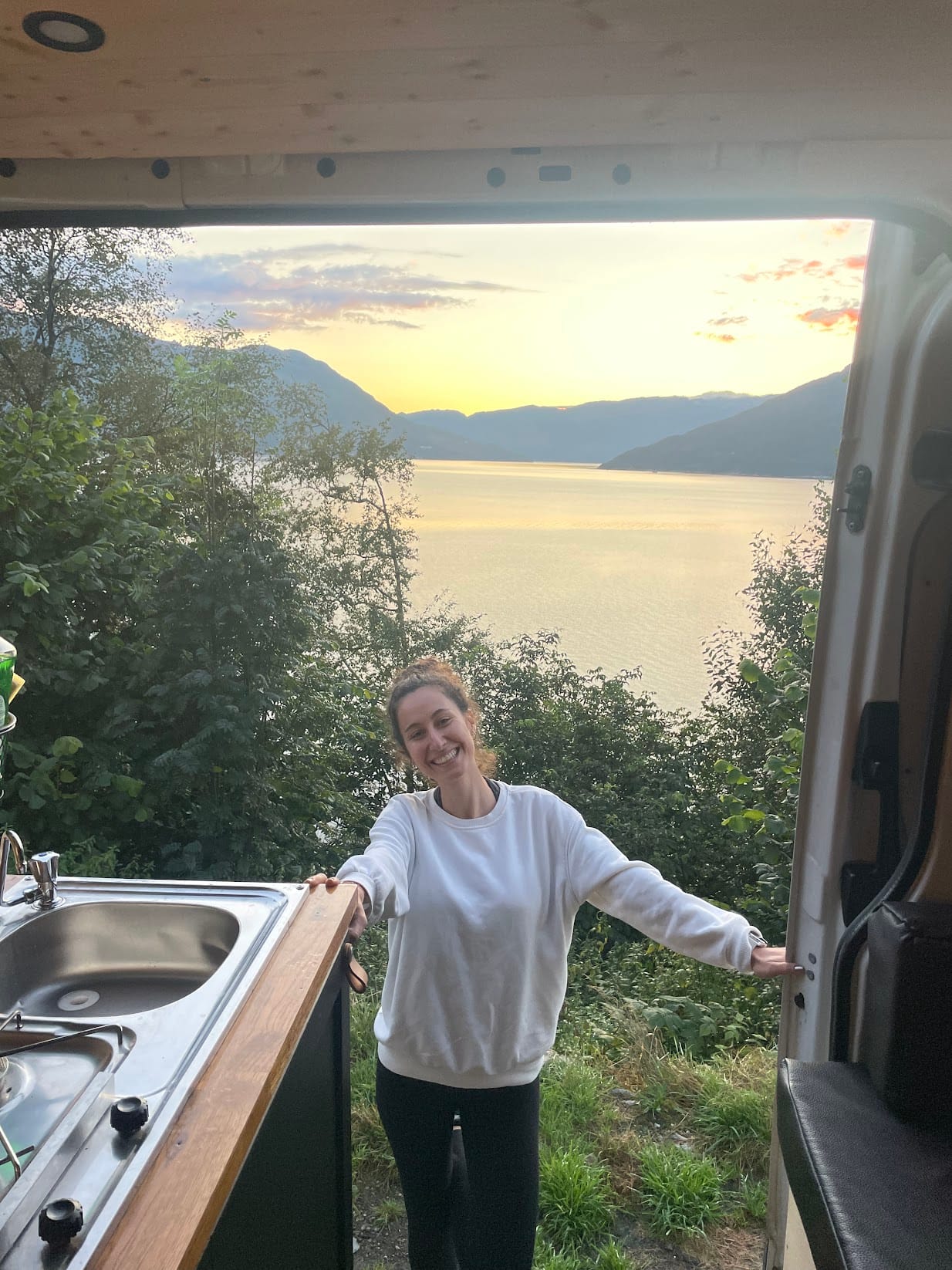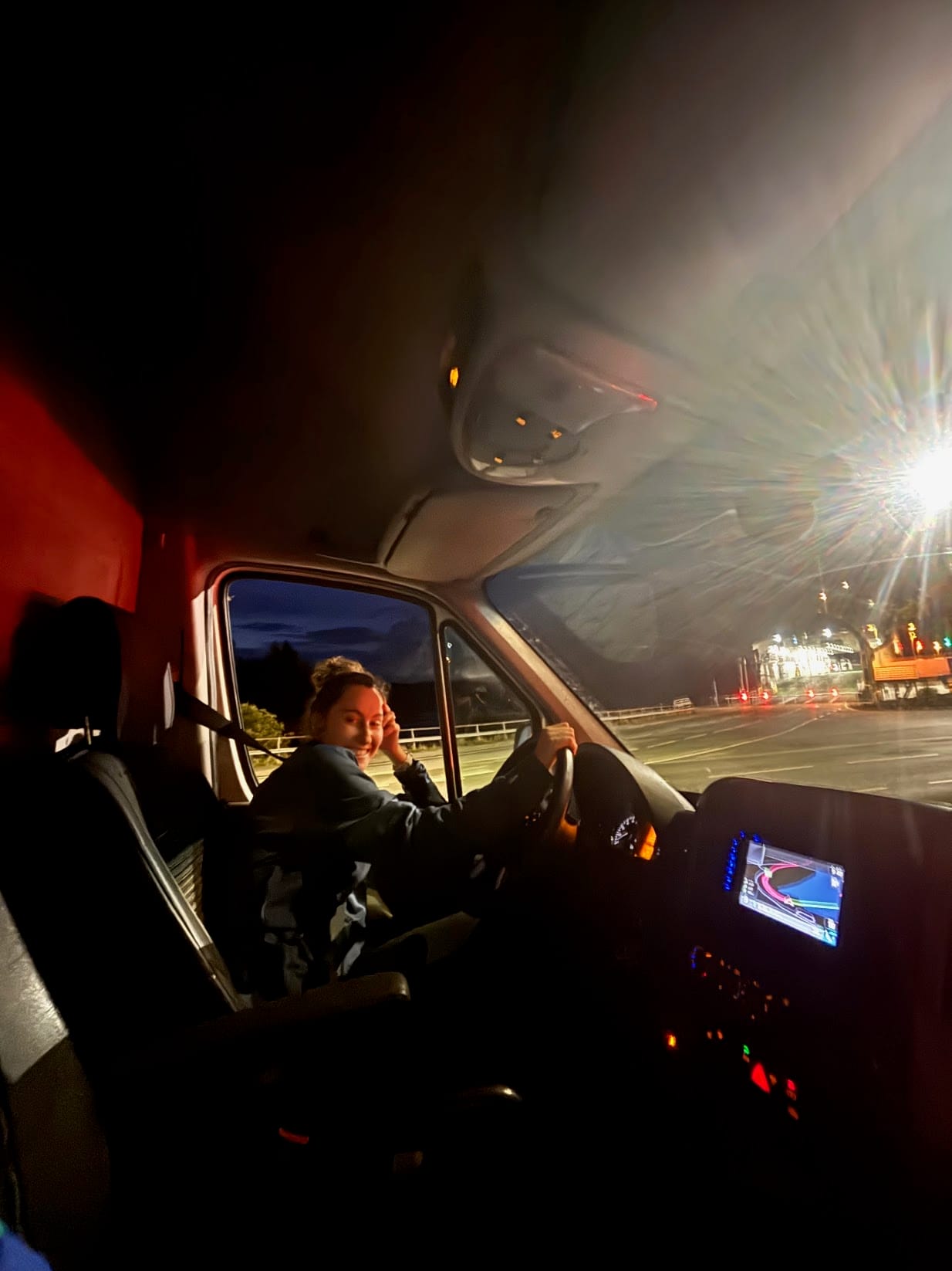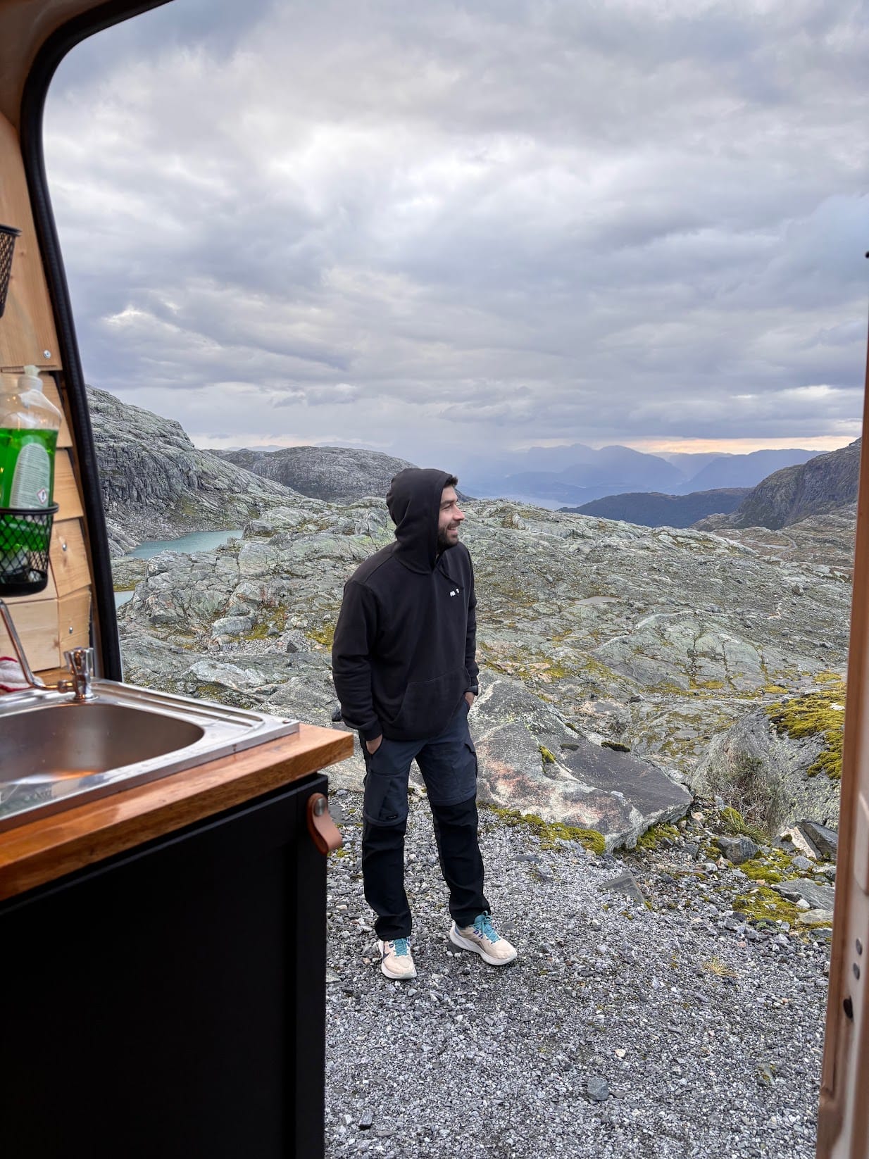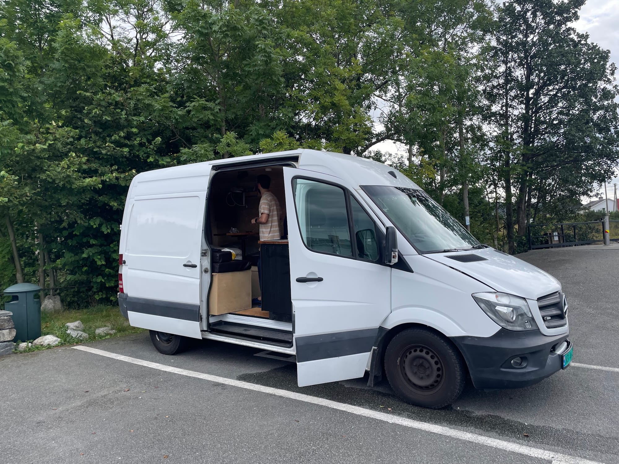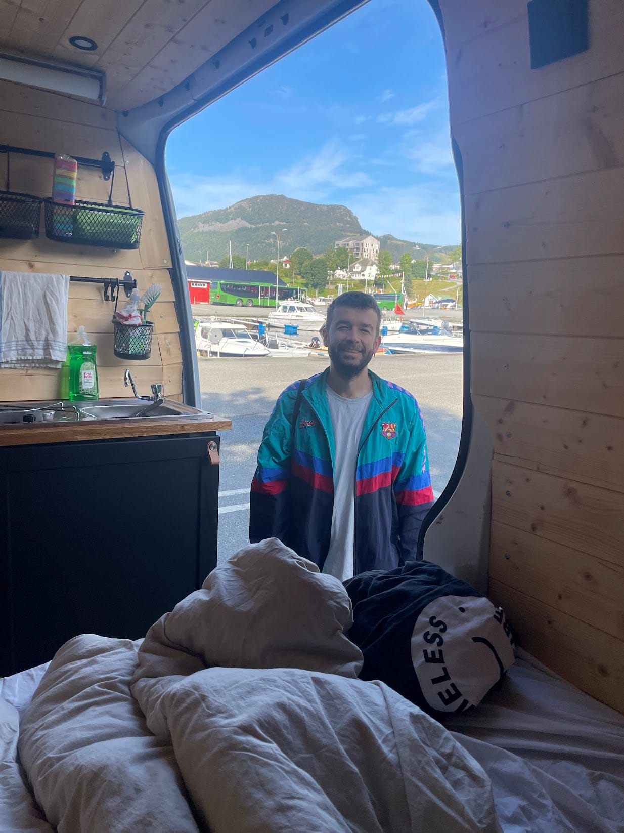 Feribottan indikten sonra karavanı Birk’ten (Firma temsilcisi) teslim alacaktık. Birk bizi limandan alacaktı. Etrafı kesmeye başladık. Bir tane karavan vardı ama üzerinde “Cabin Campers” yazmıyordu, emin olamadık. Derken biri aradı — bizim adam! 🙌 Bindik karavana, teslim eden kişiyi evine bıraktık, evinin önünde tüm detayları anlattı, anahtarları verdi ve artık karavanımız bizdeydi. Araç bir Mercedes Sprinter. Karavan detaylarını ayrı bir yazıda anlattım, buyrunuz LINK-TIK ✌️.