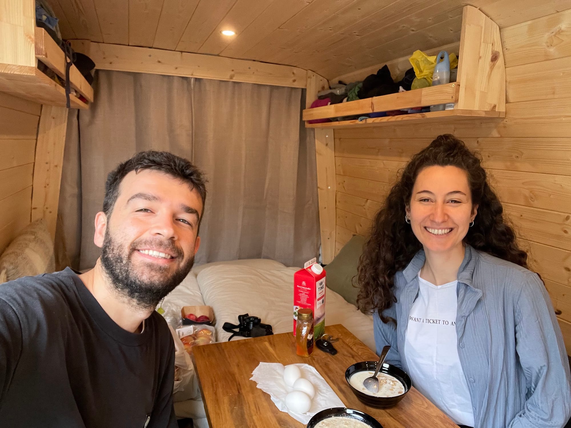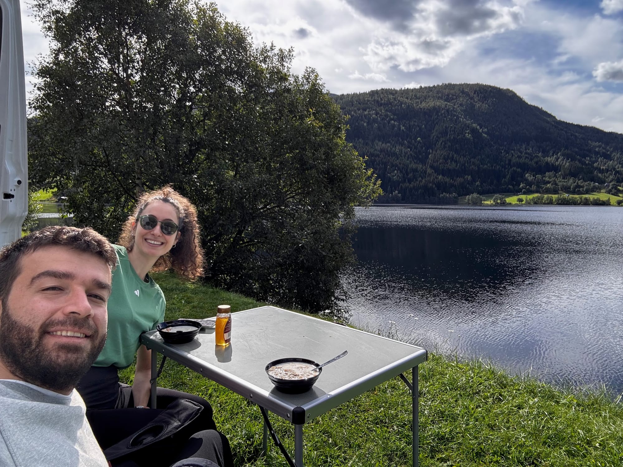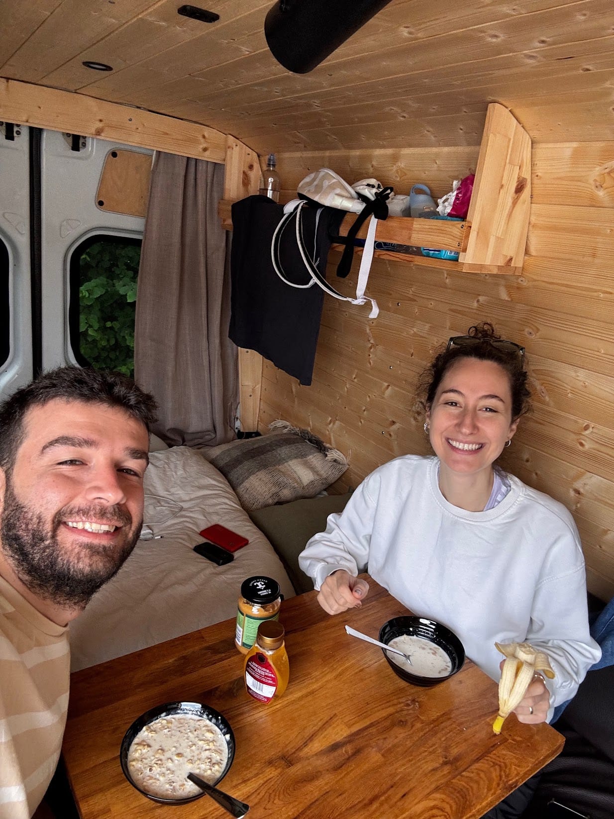 Ben ancak kendime geldim ve sonrasında karavanı toparladım. Kahvaltı için klasik bir başlangıç yaptık: yulaf ve süt. ☕️