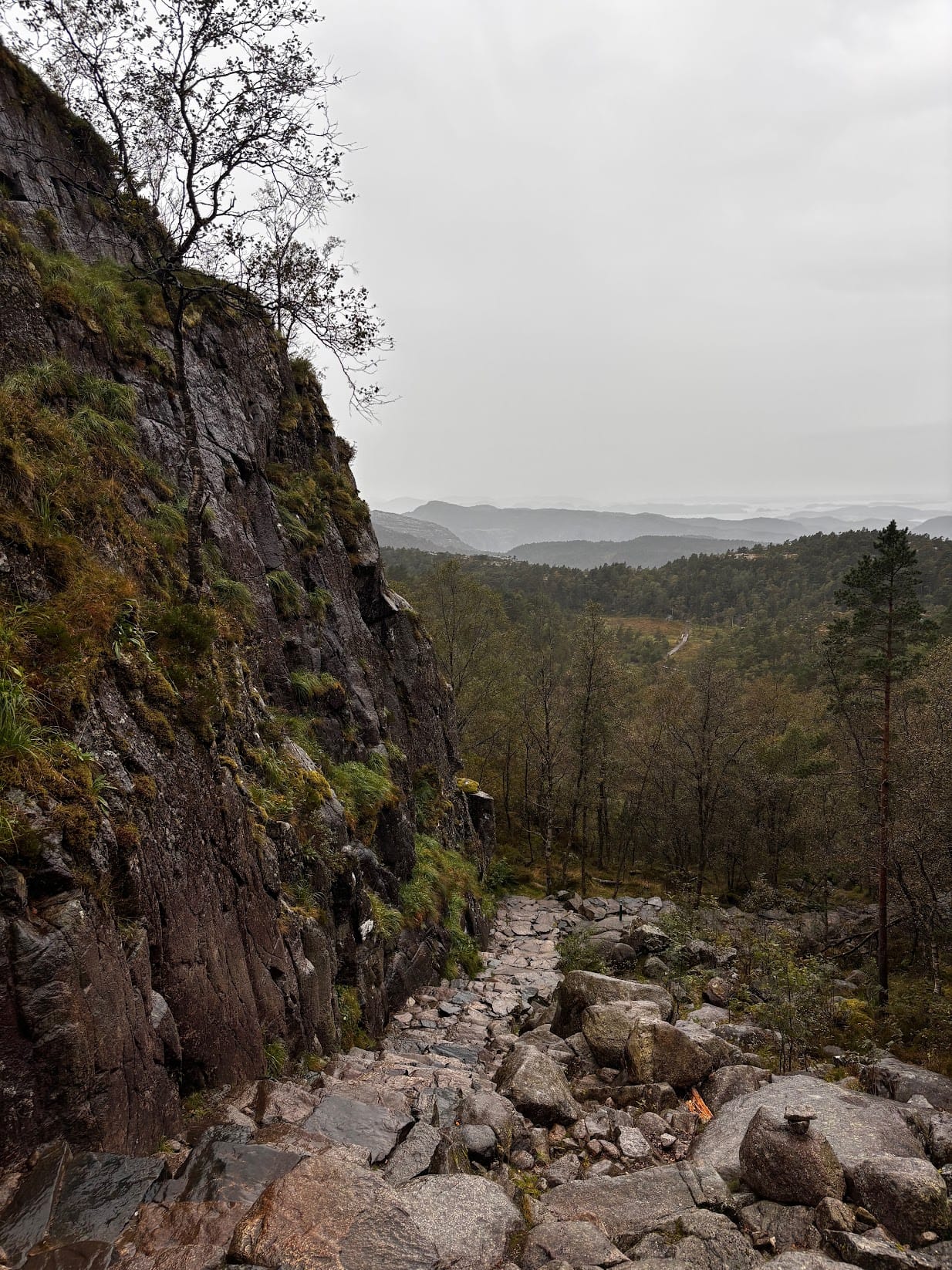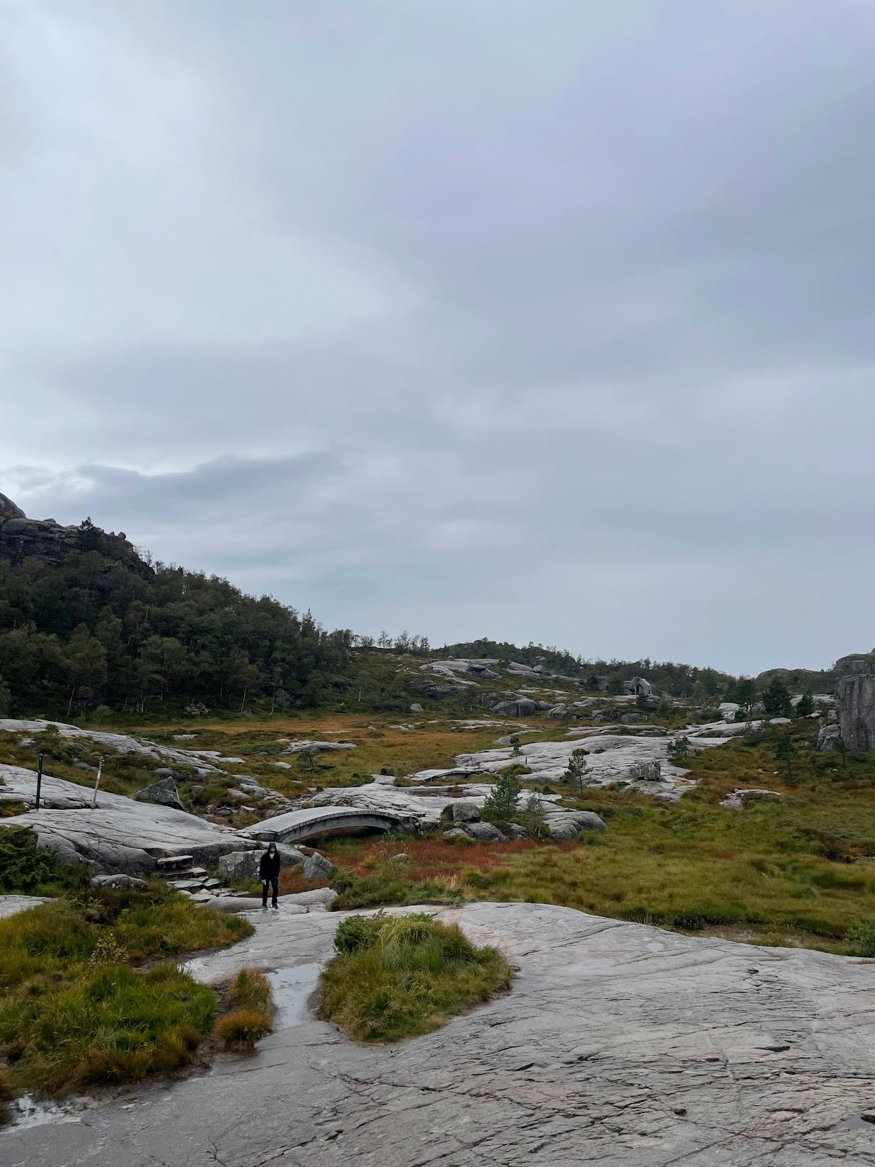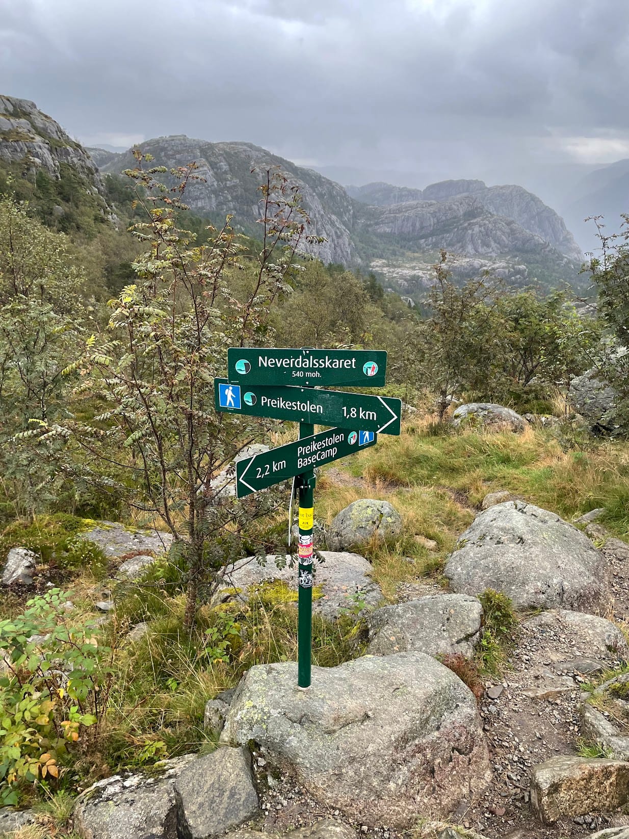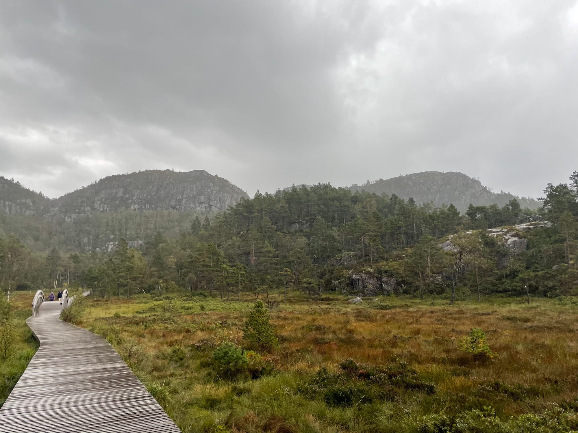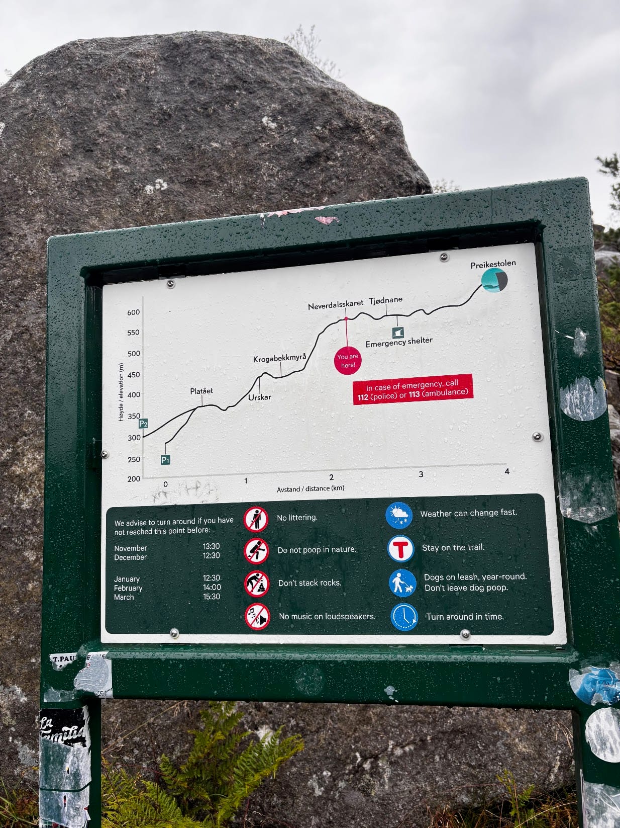 Size biraz burası hakkında bilgi vereyim, burası Stavanger yakınlarında, Norveç’in güneybatısında bir taş kütlesi, uçurum. Toplam yürüyüş mesafesi yaklaşık 7,5–8 km (gidiş–dönüş). Yükselti kazanımı yaklaşık 330–350 metre. Normalde ortalama kondisyonla 4–5 saat (2 saat çıkış + 1,5–2 saat iniş) süreceğine dair bilgiler vardı internette. Ama saat açısından bizim çok daha performanslı bir gidiş geliş gerçekleştirmemiz gerekiyordu.