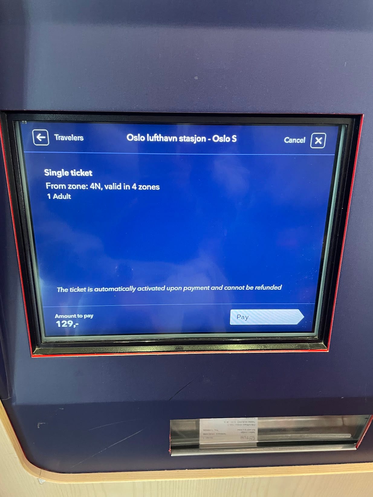 Havalimanından tren istasyonuna ve merkeze doğru geçiyoruz. İki seçenek var: biri ekspres tren, diğeri daha yavaş (bu arada öyle yavaş falan değil, araştırınca öyle çıkıyor ama gayet hızlı bir ulaşımdı) ama ucuz olan. Ucuz trenin tek yön bilet fiyatı 129 NOK.
