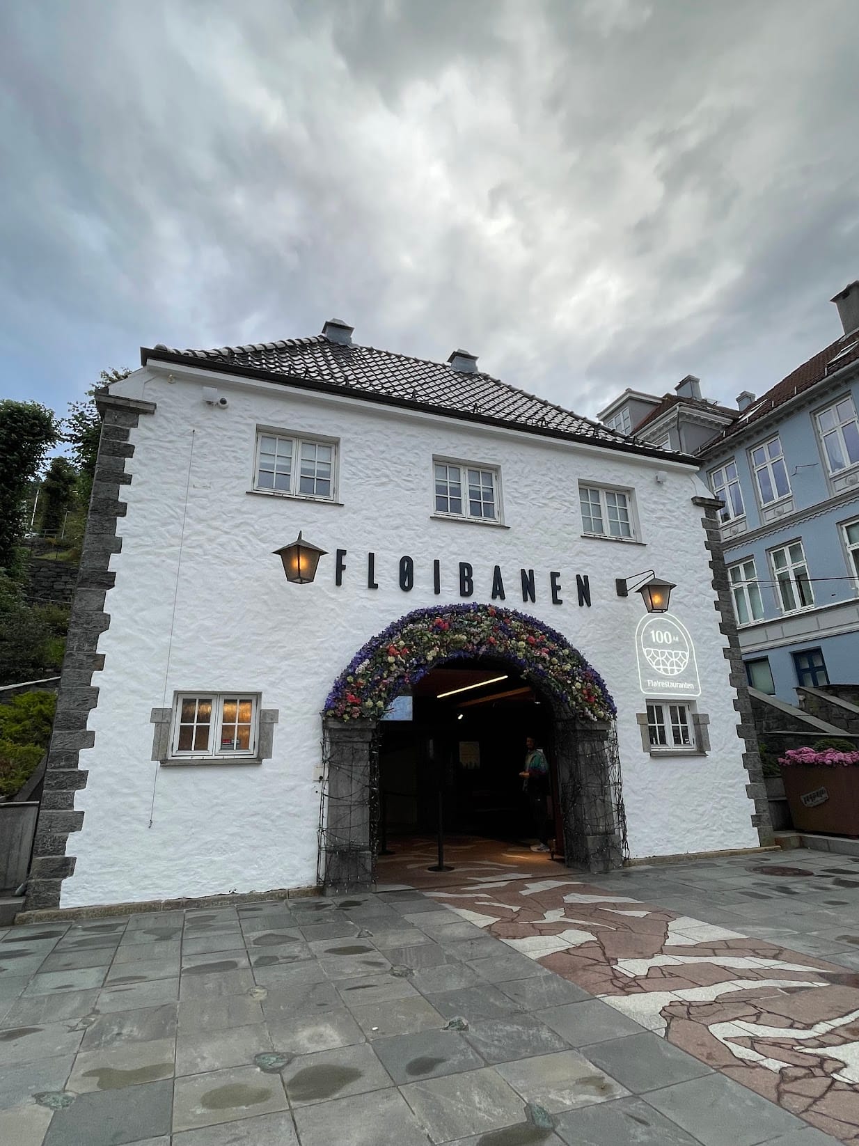 Sonra Fløibanen teleferiğine yürüdük. Biletleri kiosktan aldık — tek yön 100 NOK, gidiş-dönüş 190 NOK. Fiyatlar sezona göre değişiyor ama biz en yüksek sezona denk gelmişiz tabii.