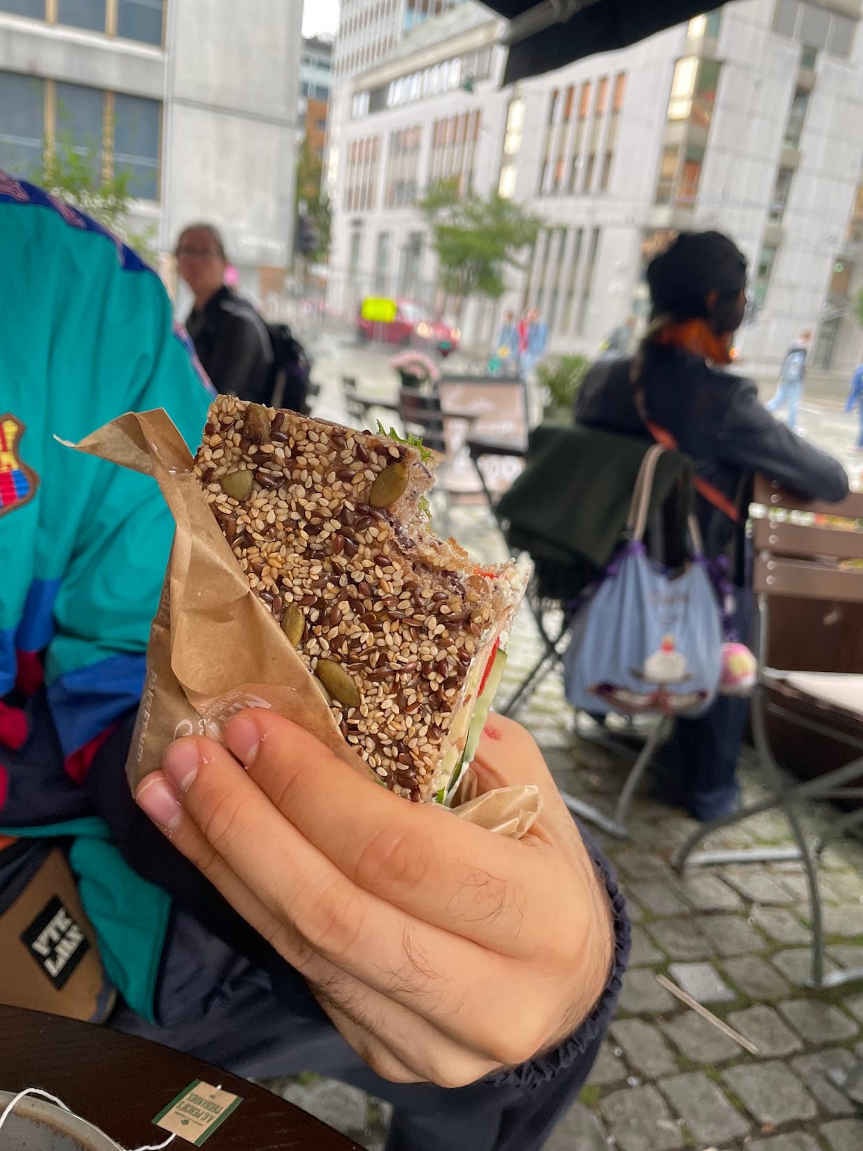 Şehir merkezinde Godt Brød’de bir mola verdik, sandviç ve çay keyfi yaptık, baya lezzetliydi. Hesap: 340 NOK. 😅