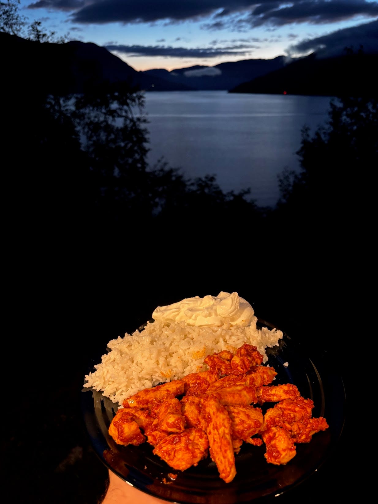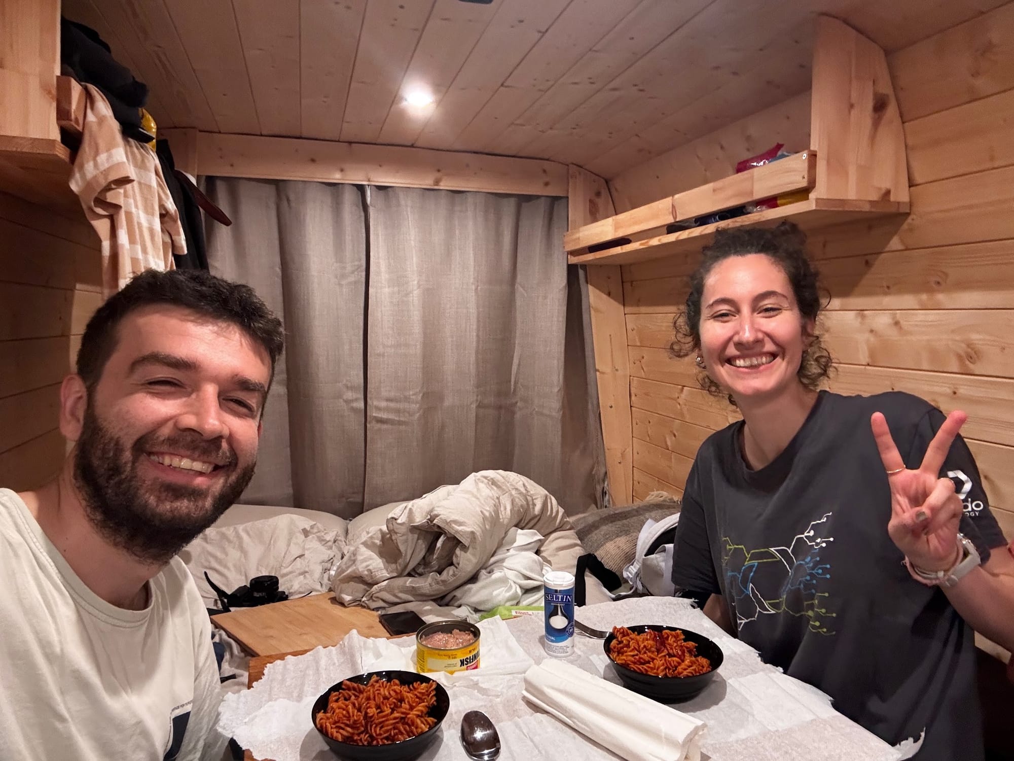 Biraz daha ilerliyoruz ve ücretsiz bir konum buluyoruz. Önceden gelmiş bir karavanın arkasında yerimizi alıyoruz. Manzara güzel, karşı taraf hafif aydınlık. Uzun zaman sonra zifiri karanlık olmayan bir kamp yerine denk gelmiş oluyoruz böylece. 🌄 Akşam menüsü klasik: makarna + ton balığı + çay. 🍝🐟☕️