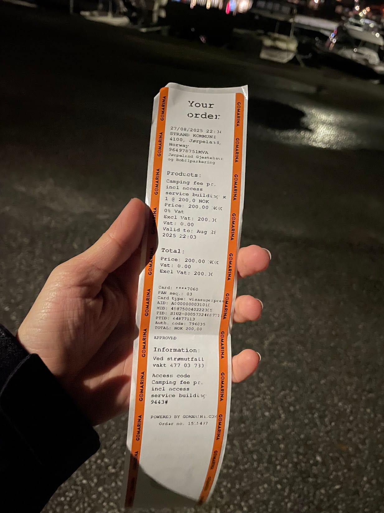 Hava yavaş yavaş kararmaya başlıyordu. Aracı aldıktan sonra ilk iş Kiwi markete uğradık, bir-iki günlük malzeme alışverişi yaptık — yaklaşık 60 euro tuttu. Sonra yönümüzü Pulpit Rock (Preikestolen) tarafına çevirdik, yarın planımız oraya hikinge gitmek. Ama “sabah gitmeyin, çok kalabalık oluyor” önerisinden dolayı planlarda yarın oynamalar yapacaktık. Biz de yakınlarda bir karavan park alanı bulduk, Jørpeland Bobilcamp, burası bir yat limanı, hem yatlara hem de karavanlara su, elektrik ve tuvalet banyo erişimi sağlamışlar. 200 NOK karşılığında tuvalet ve banyoları kullandık. 🚿