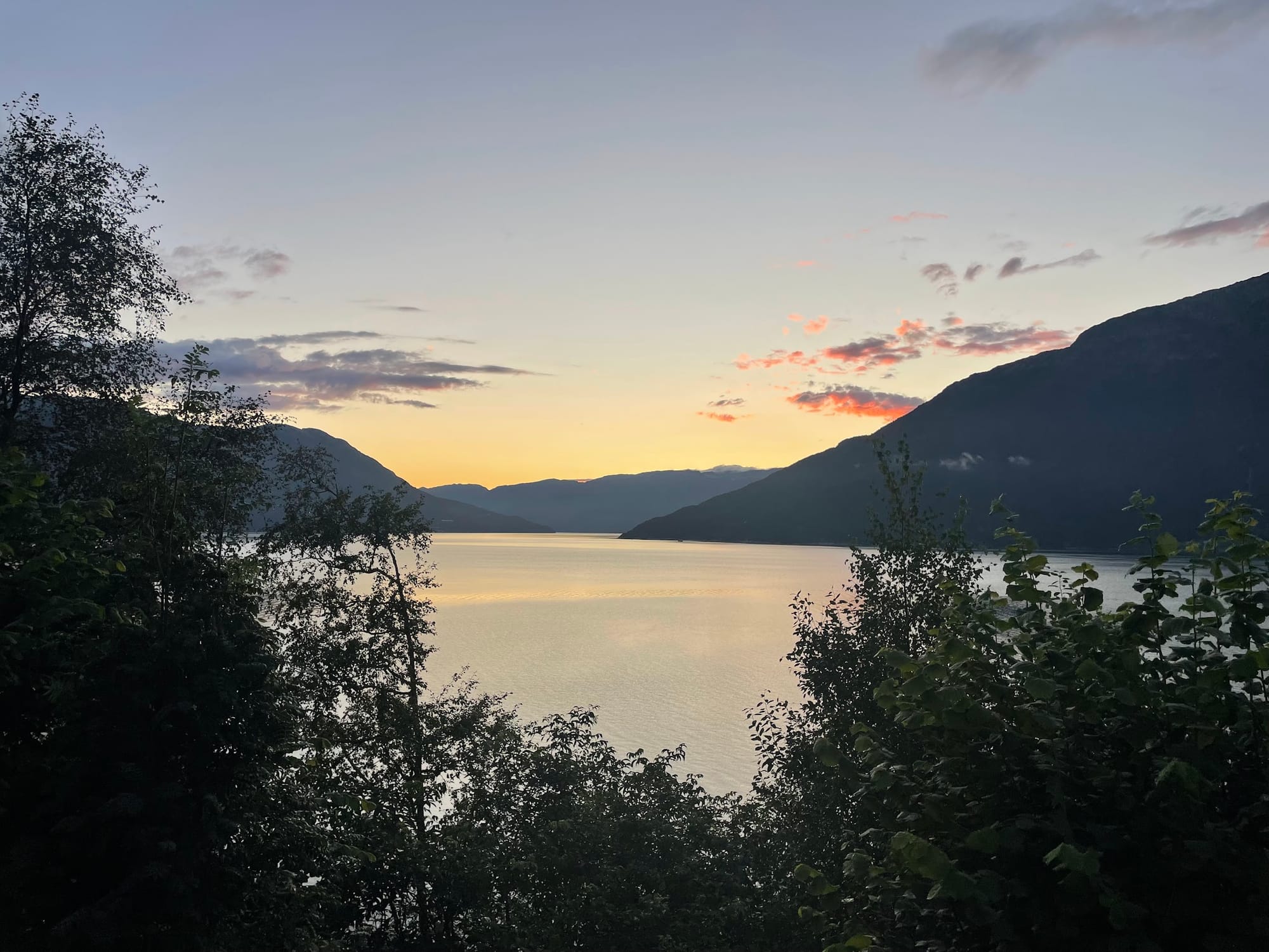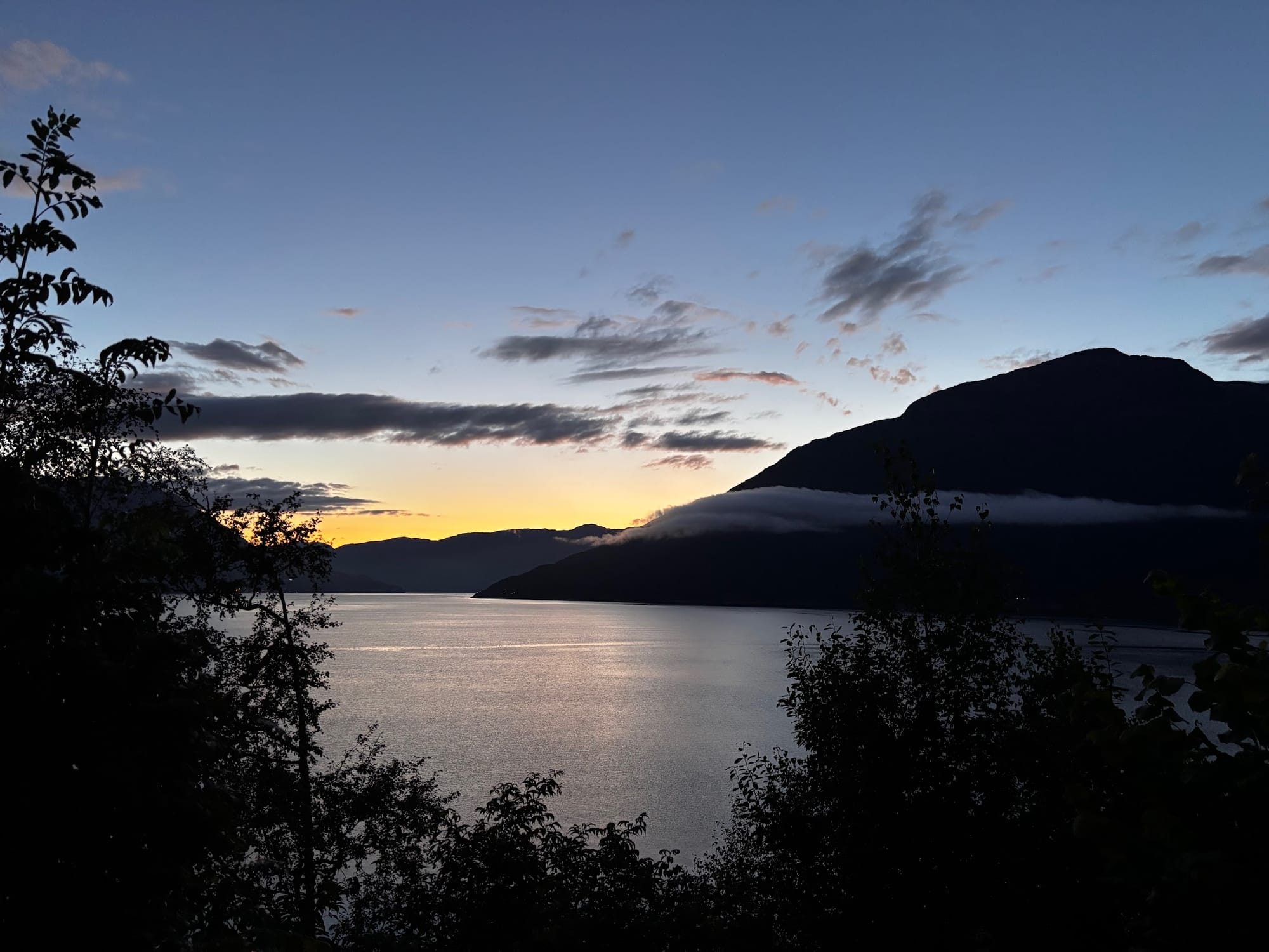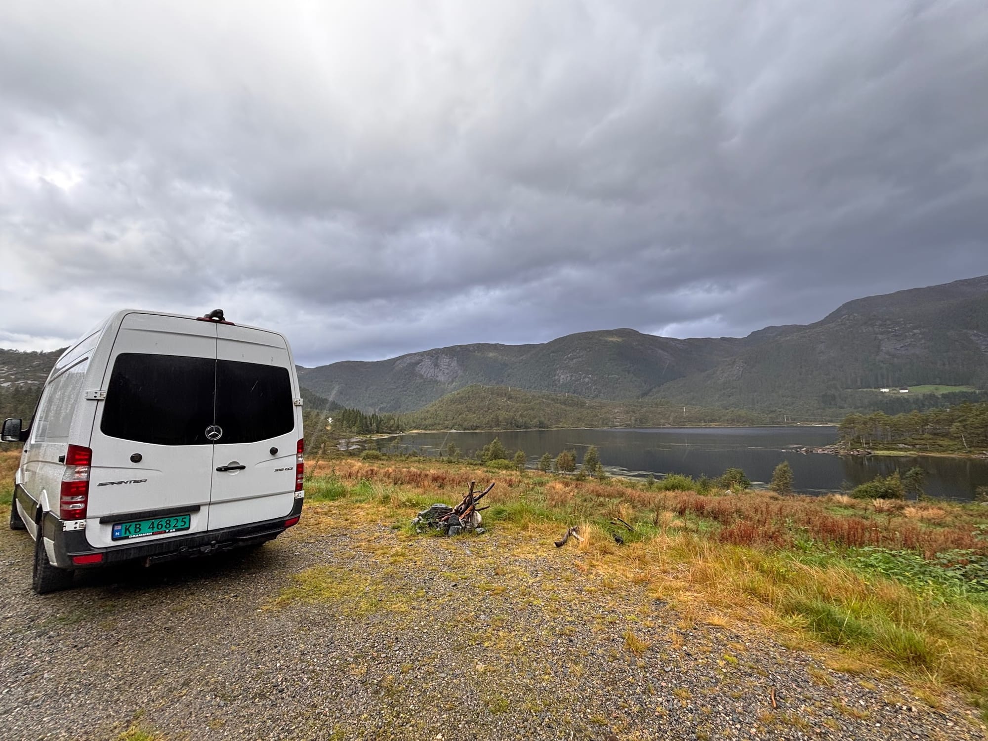 Sonra Lavik’ten Ytre Oppedal feribotuna bindik, yolumuza devam ettik. Güne geç başlamanın verdiği etki ile gün çabuk bittı ve hava kararmadan kamp yeri aramaya başlıyoruz. Camp4Night'tan yine güzel birkaç nokta bulup tek tek ziyaret ediyoruz. Orman yolunda gölün karşısında bir noktada (KONUM) duruyoruz. Her şey güzel, ama bir tık tenha geliyor, kimsecikler yok, yoldan kimse geçmiyor, hayırlısı diyip yerleşiyoruz.