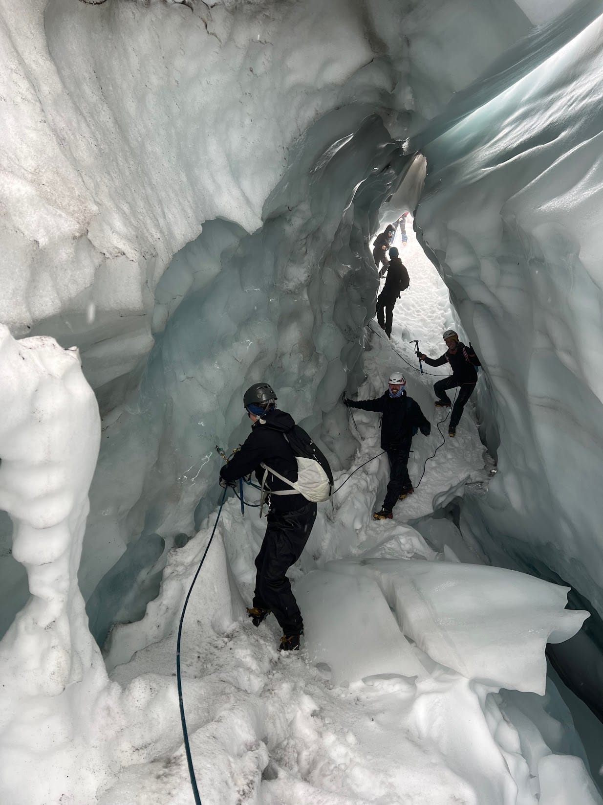 Yavaş yavaş buzulun üstünde yürüyoruz; görüntüler müthiş — dev yarıklar, buzun mavi parıltısı, ve bir de tünelden geçiyoruz.