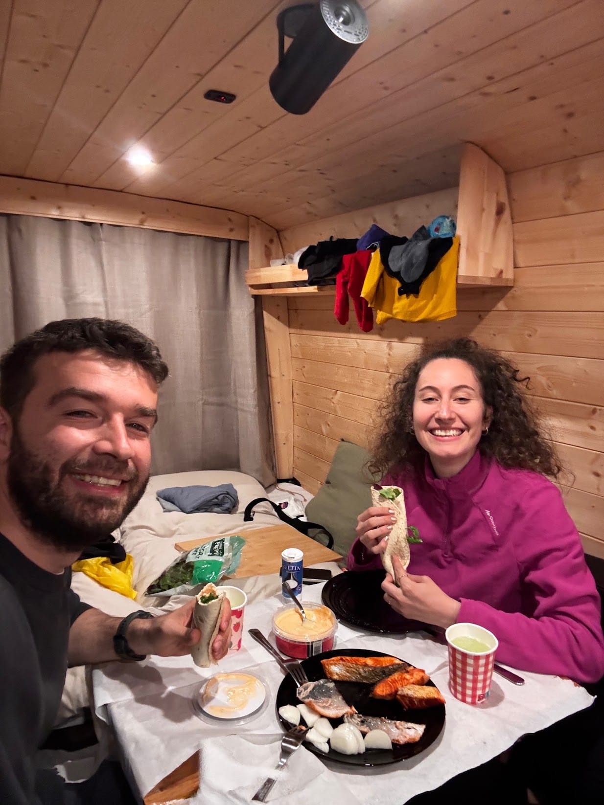Sonra bir AVM otoparkında çorba içip kahve keyfi yaptık, evet, Norveç’te AVM otoparkında “mini kamp” ruhunu yaşattık 😄.