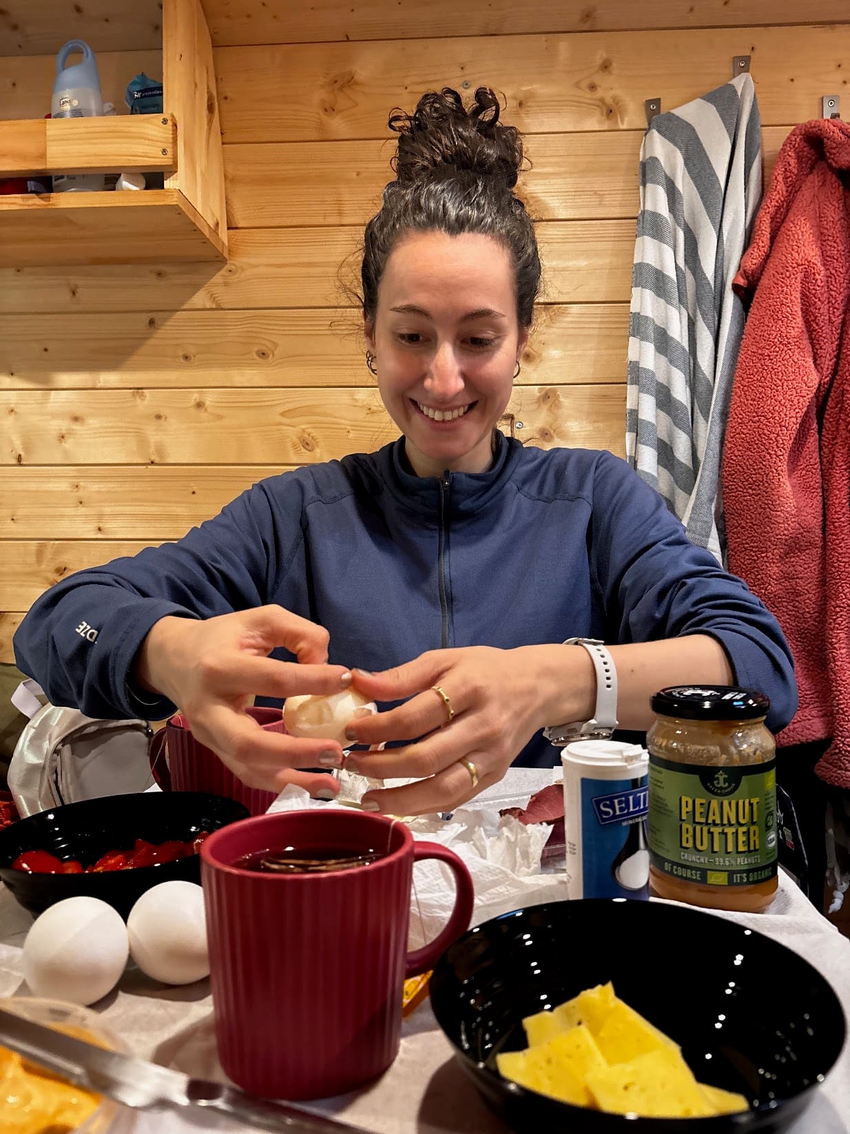 Manzara eşliğinde kahvaltımızı yapıyoruz. Bugün menüde menemen var.