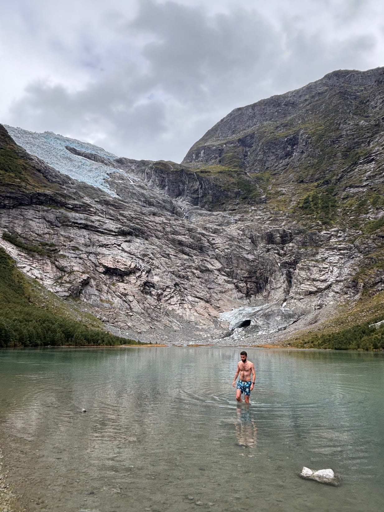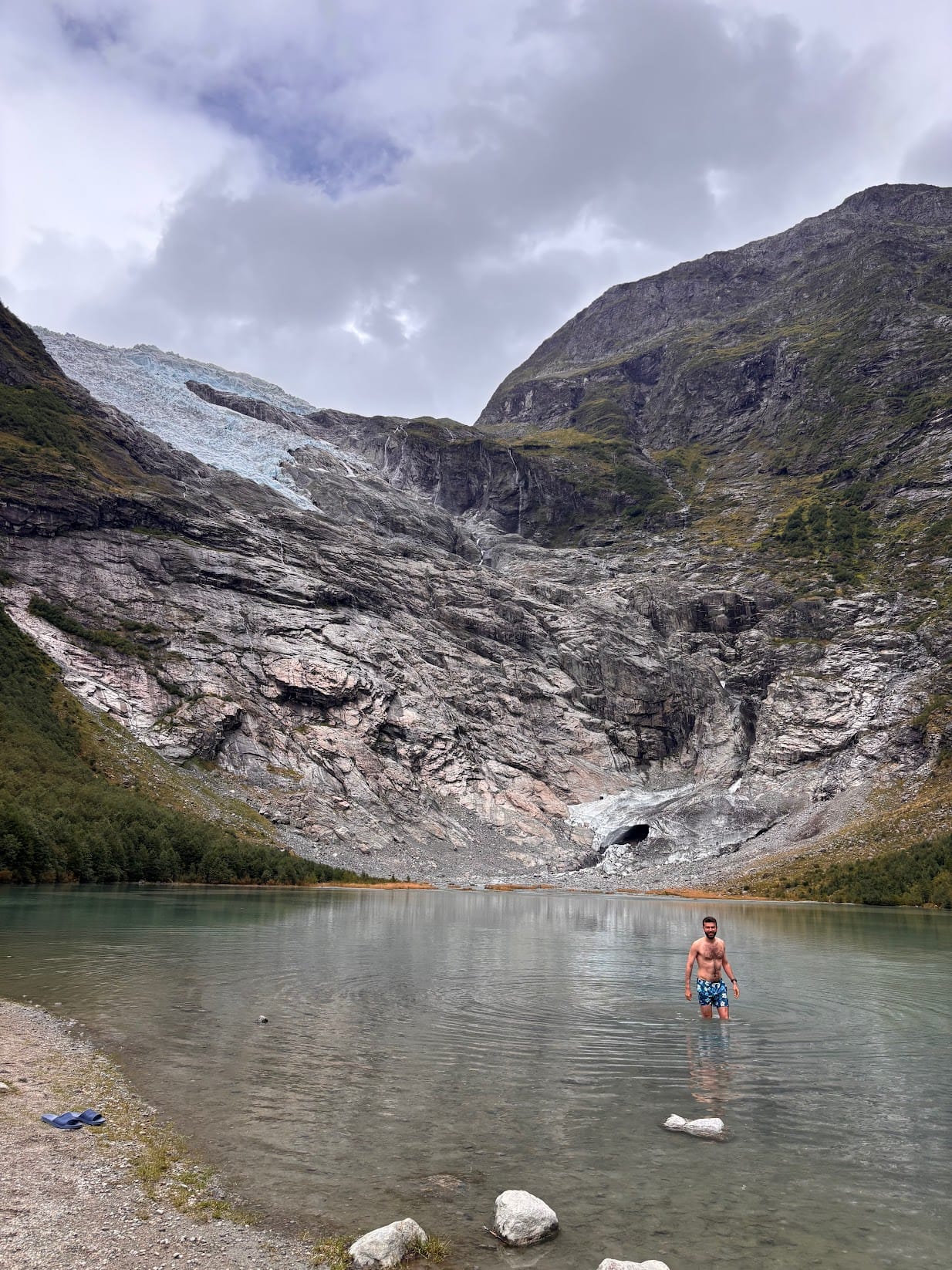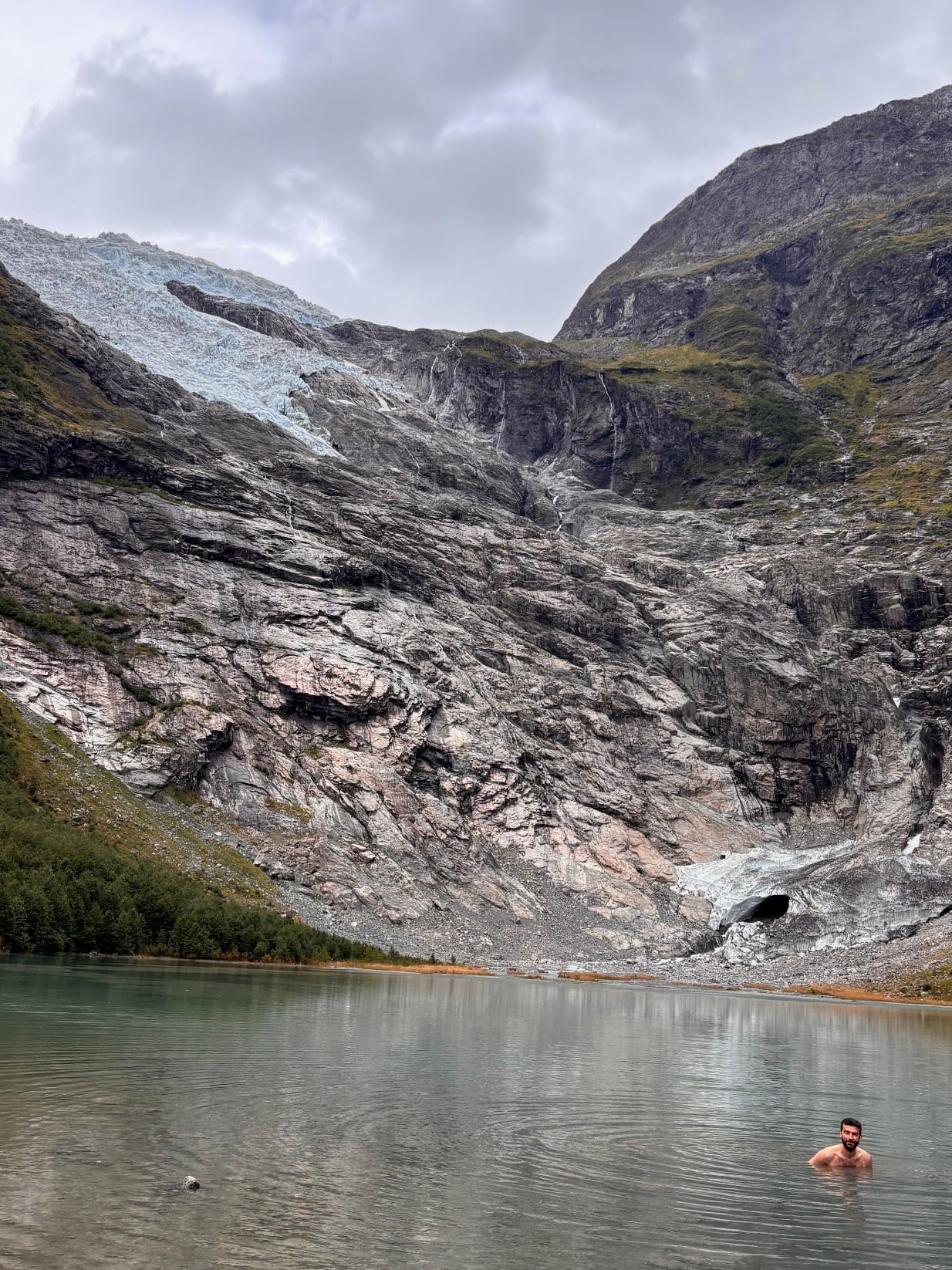 Sonra Bøyabreen Glacier'e gittik. Karşımızda muhteşem bir göl ve arkasında koca bir buzul manzarası.
