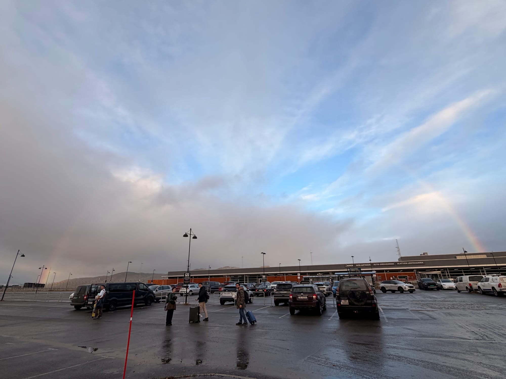 Ve 11:21’de iniş yaptık. Manzara muhteşemdi — tepelerin üstü karla kaplıydı ve bizi bir gökkuşağı karşıladı. Gerçekten büyüleyici bir sahneydi! 🌈