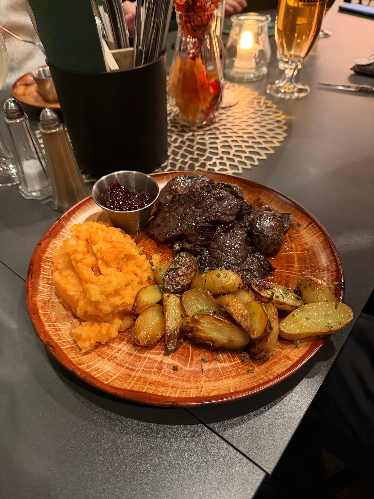 Menüdeki ren geyiği etinden farklı farklı tabaklar vardı. Biz de deneyimledik ancak ne yazık ki bizim akşam yemeğimiz beklentilerin biraz altında kaldı, pek damak tadımıza hitap etmedi 😬