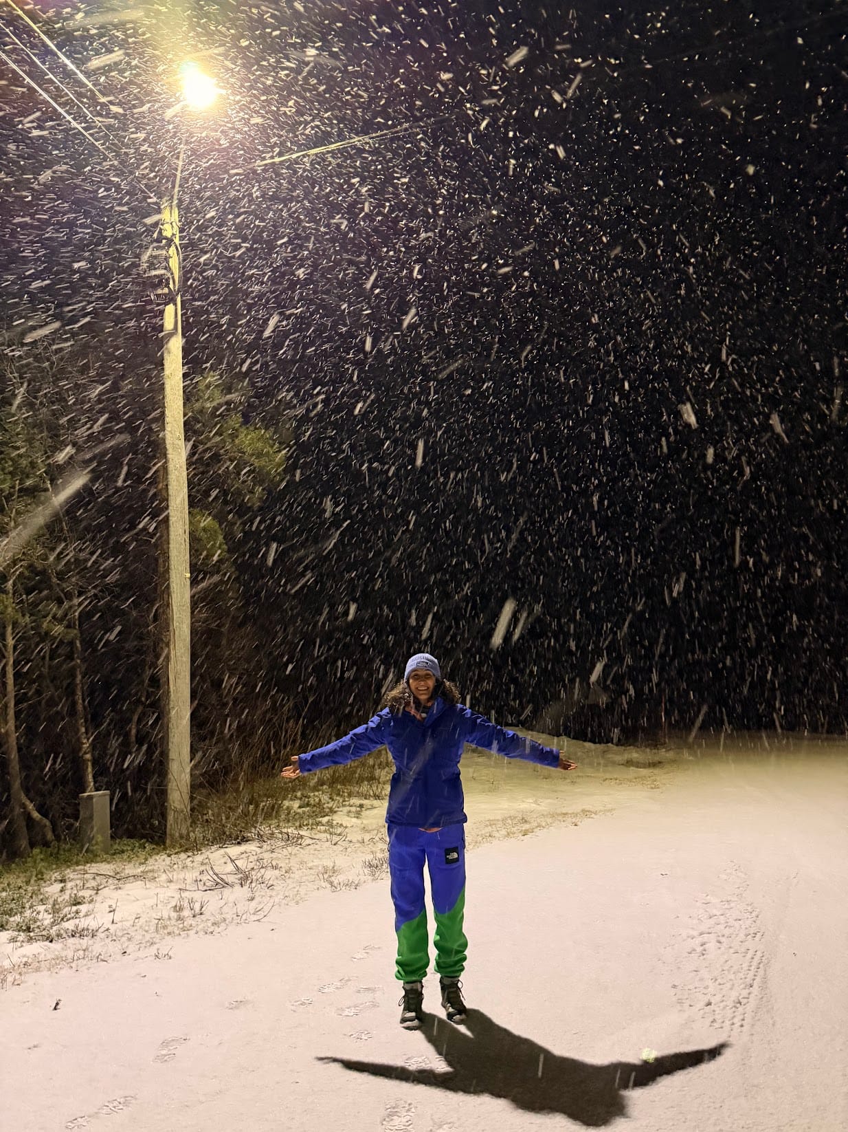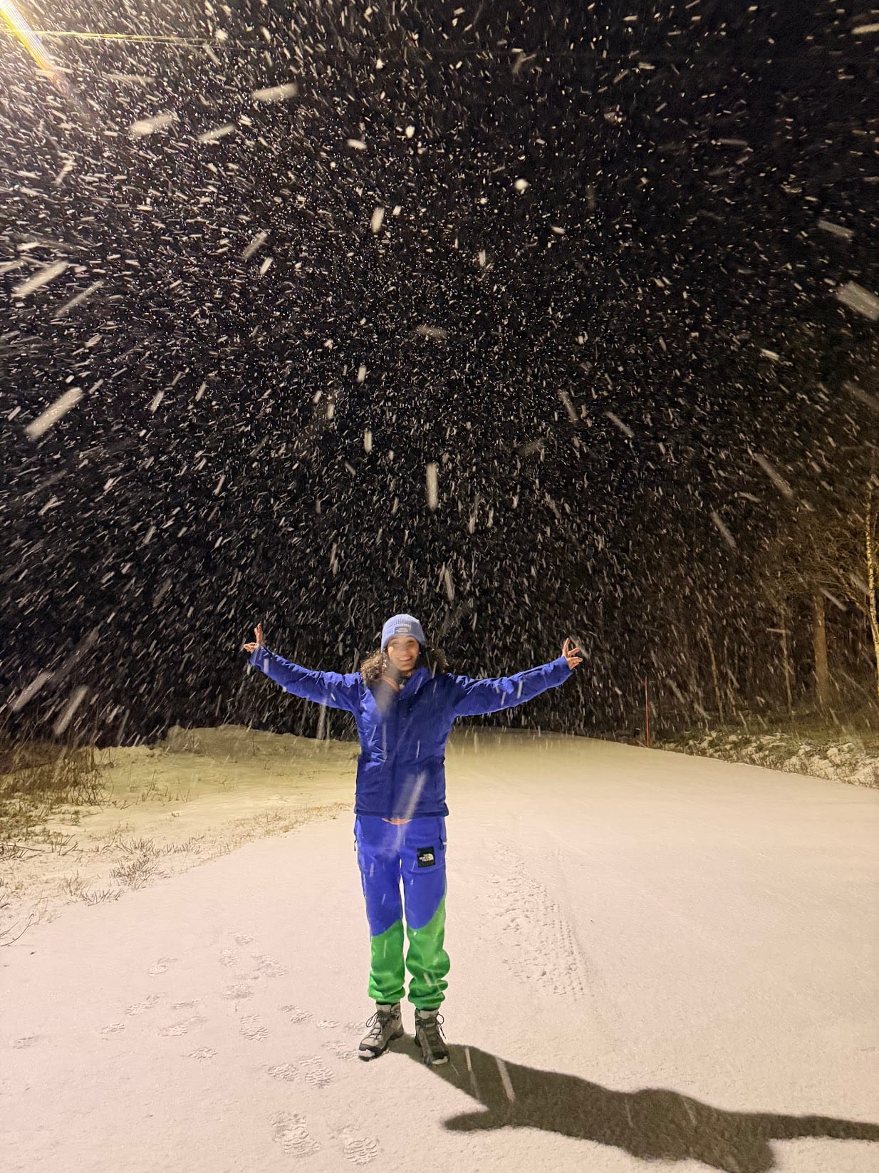 Saat 11 gibi, kar yağışı başlıyor. Tamam diyoruz, artık gökyüzünü taramaya çalışmaya gerek yok. Kuzey ışıkları faslı bitti. Ama bu sefer ise kar yağışının keyfi yerini alıyor. Uzun zamandır bu kadar lapa lapa kar yağışına şahit olmamıştım. Yine her şey aşırı masalsıydı.